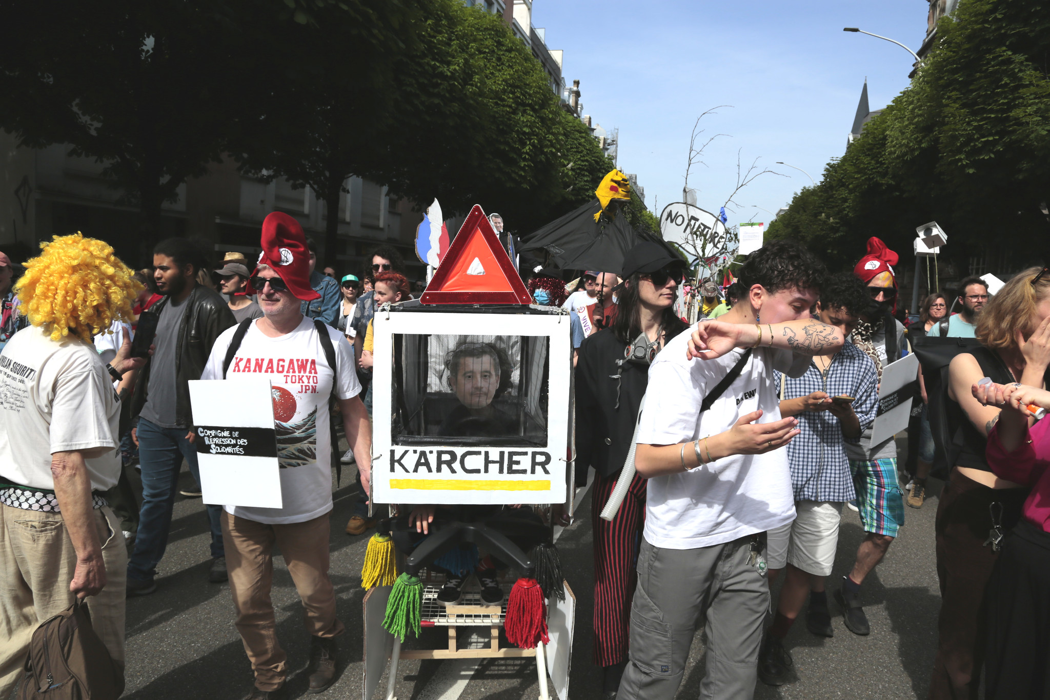 Six chars carnavalesques dénonçant les Jeux olympiques ont été fabriqués les jours précédents. L’un d’entre eux intègre une effigie de Gérald Darmanin, siglée « pas de migrants, pas de pauvres », en référence aux déménagements forcés de demandeurs d’asile et d’étudiants pour faire de la place aux futurs spectateurs des JO.