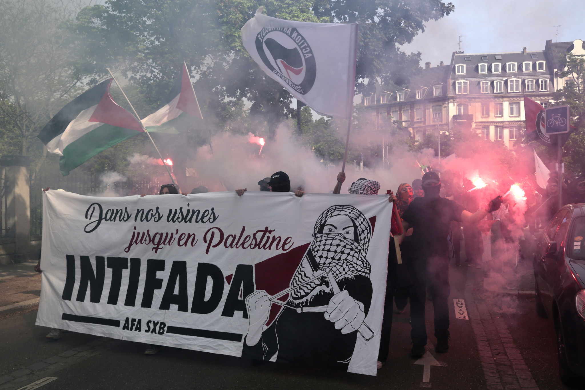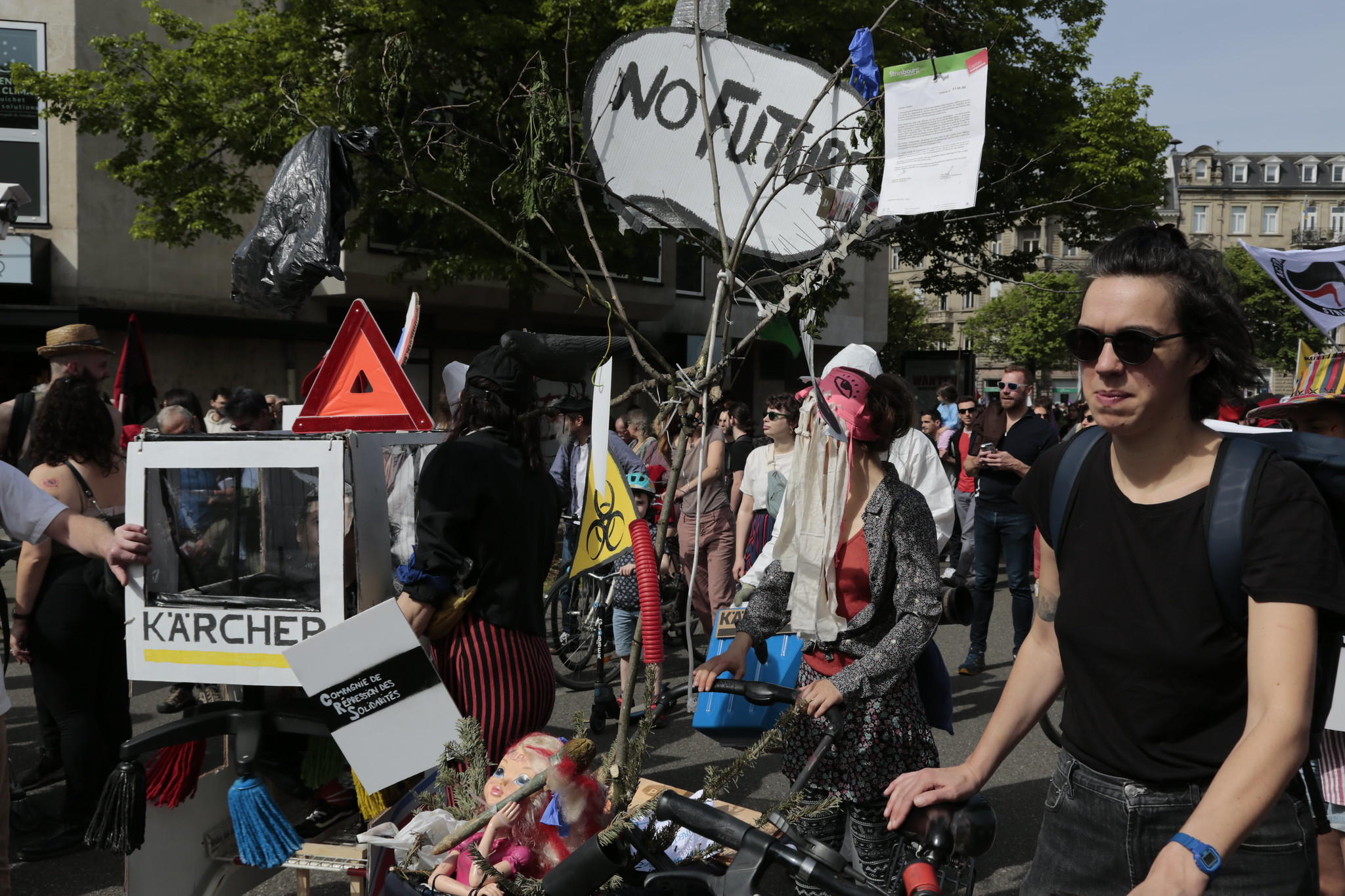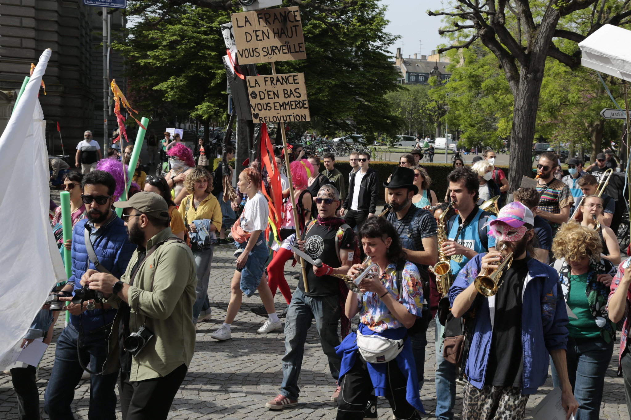 Un mur de son crache devant de jeunes teufeurs, avenue de la Forêt-Noire. Scène peu habituelle pour ce quartier cossu de Strasbourg. Les riverains regardent depuis leurs balcons fleuris, l’air parfois amusés, parfois perplexes. Autour de 3 000 personnes se sont mobilisées pour participer à la manifestation du 1er-Mai, journée internationale des travailleurs et des travailleuses.