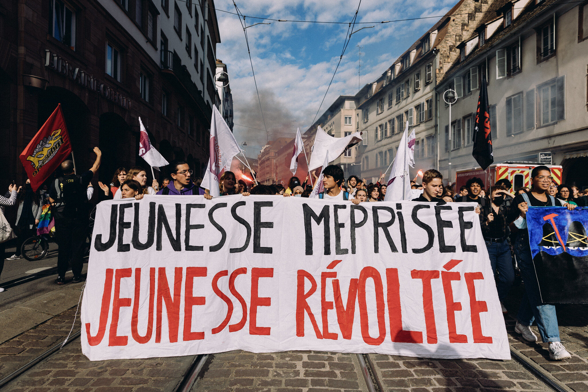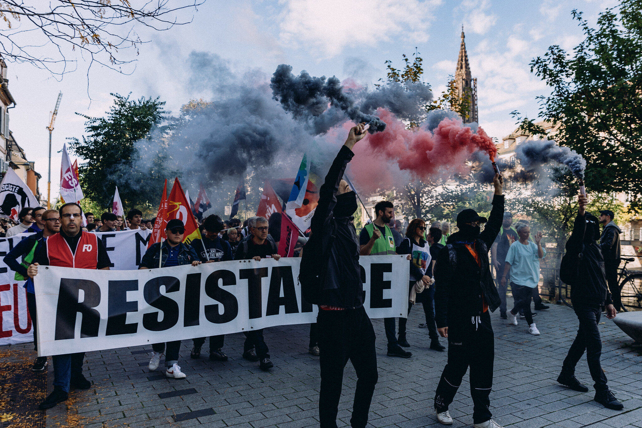 Les organisations de jeunes Fidl, MNL, Unef et la Vie lycéenne prennent aussi part à la mobilisation et sont positionnées en tête de cortège. Des militants allument des fumigènes noirs et rouges. Margo, en deuxième année à Sciences Po Strasbourg, explique qu’elle a choisi de venir aujourd’hui car la mobilisation prend de l’ampleur :