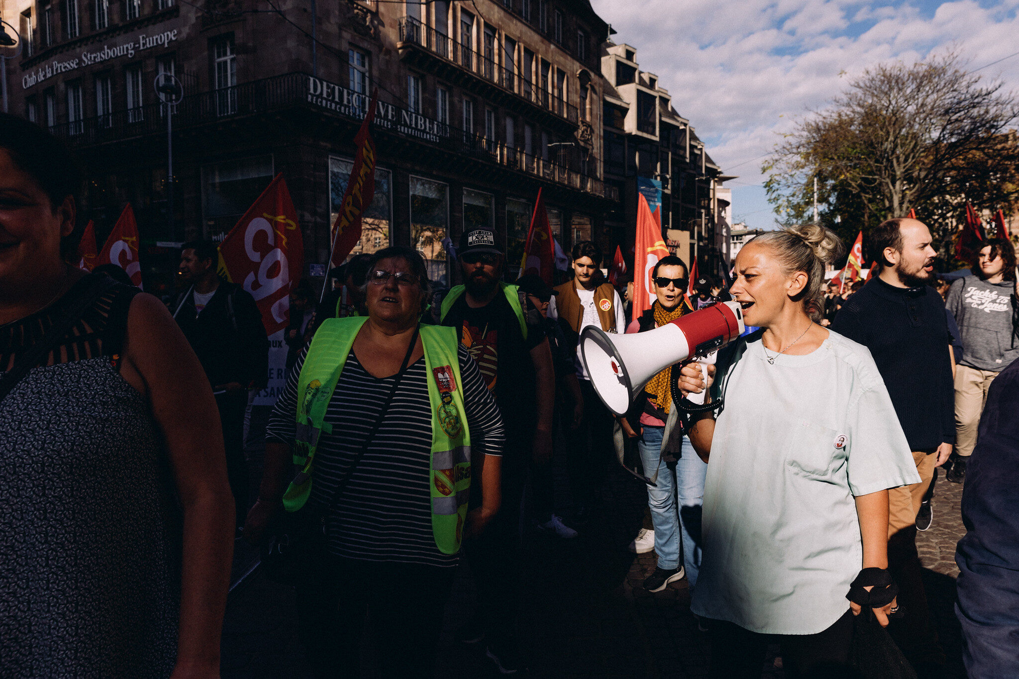 « C’est bien de voir du monde mais ça devrait être encore plus gros », lance Marie, retraitée. Vers 11h30, 2 000 personnes partent de la place Kléber, derrière les banderoles CGT, FO, FSU et Solidaires, pour revendiquer des augmentations de salaires au vu de l’inflation et soutenir les grévistes des raffineries. Le gouvernement redoute une contagion de la mobilisation et la formation d’un mouvement social cet automne. Dans l’Académie de Strasbourg, entre 2 et 4% des personnels de l’éducation n’ont pas travaillé mardi 18 octobre. Les lycées professionnels enregistrent le plus fort taux de participation avec 17%.