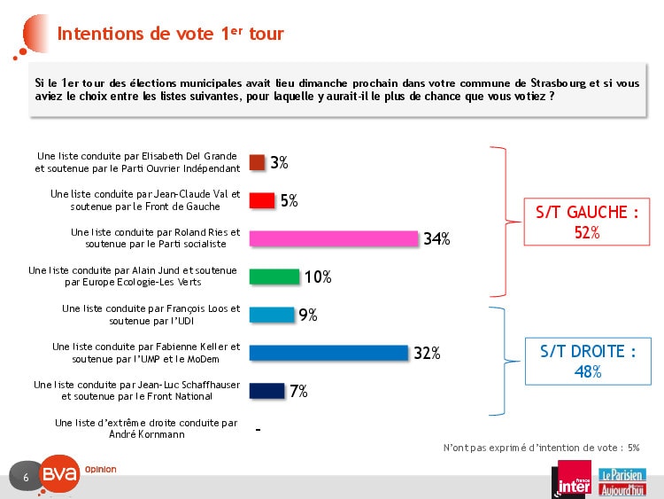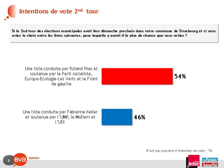 Selon ce sondage réalisé auprès de 602 Strasbourgeois par l’institut BVA pour France Inter et Le Parisien, le maire sortant Roland Ries (PS) obtiendrait 34% des voix si le premier tour des élections municipales avait lieu ces jours-ci. Juste derrière, Fabienne Keller, ancienne maire et sénatrice UMP du Bas-Rhin, récolterait 32% des voix. Ces résultats sont quasiment identiques à ceux publiés par les sondages précédents. Le 5 février, l’Ifop créditait Roland Ries de 32% des voix et Fabienne Keller de 30%. Le 15 janvier, TNS-Sofres accordait à Roland Ries 34% des voix et 33% pour Fabienne Keller…