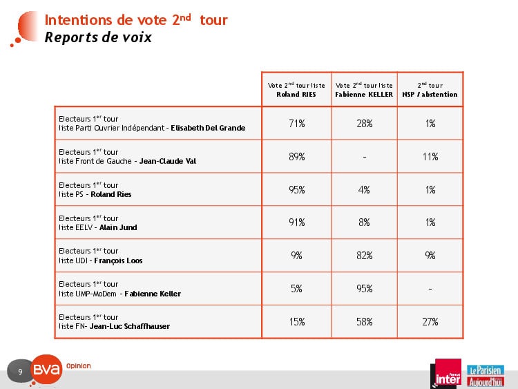 Pour le second tour, BVA parie sur un meilleur report de voix à gauche qu’à droite, ce qui fait prédire à l’institut de sondages une victoire de Roland Ries avec 54% des voix quand le total des voix de gauche du premier tour n’atteint que 52%.