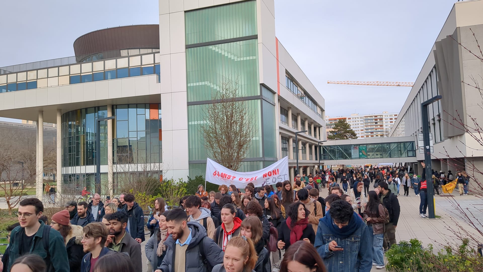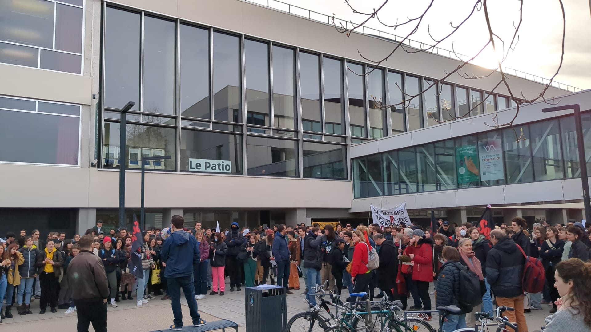 À l’appel de l’Assemblée générale étudiante, environ 300 personnes se sont réunies devant le Patio à 16h, ce jeudi 16 mars. Une heure plus tôt, Élisabeth Borne annonçait l’utilisation de l’article 49.3 pour contourner le vote des députés et adopter en force le texte sur la réforme des retraites.