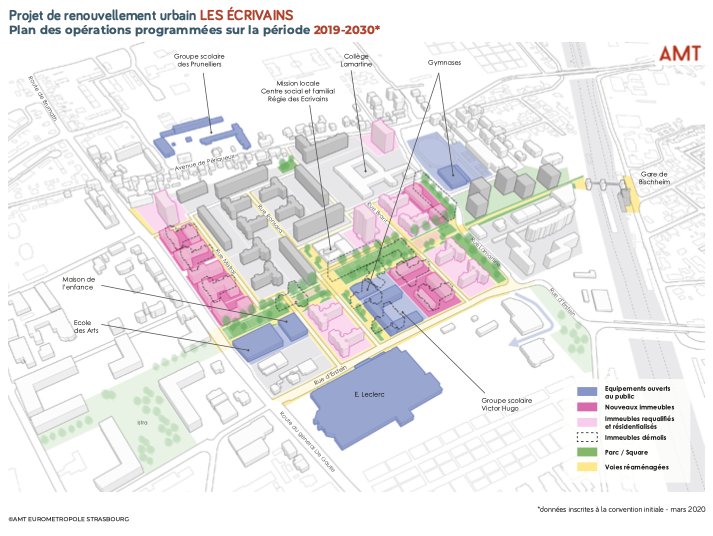 Entre 2019 et 2030, le second plan de renouvellement urbain de l’Eurométropole de Strasbourg comprend sept projets, parmi lesquels celui du quartier des Écrivains, entre Schiltigheim et Bischheim. Il fait partie du quartier prioritaire de la ville « Quartiers-Ouest » : 345 logements vont y être requalifiés (rénovés), 605 résidentialisés (privés), 302 seront construits et 336, détruits. Plus de 6 000 personnes habitent le quartier.