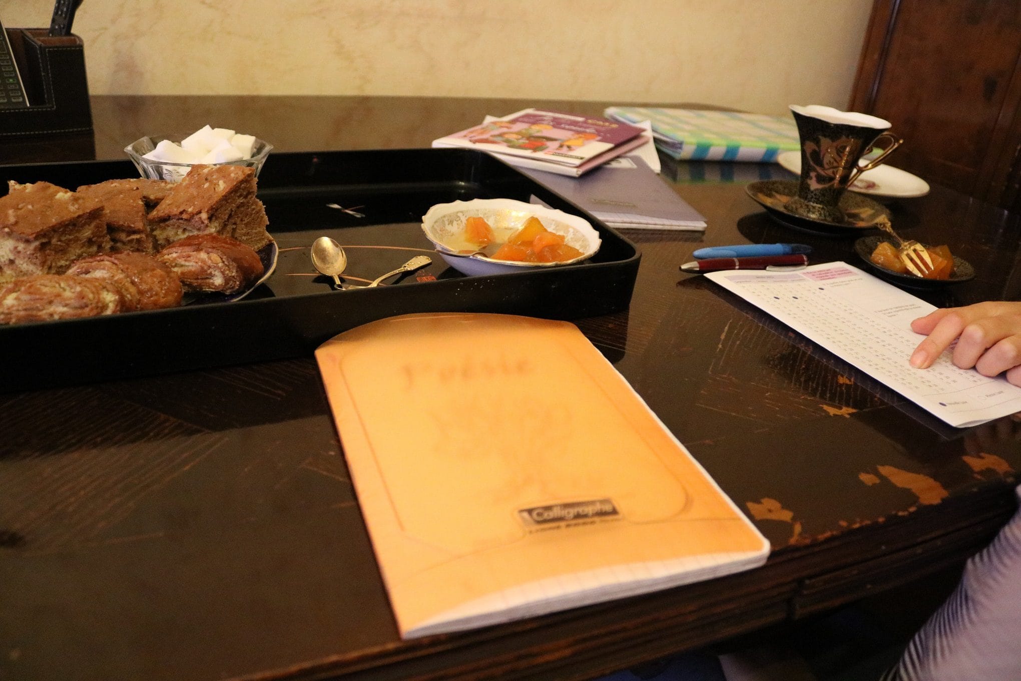 Pendant ce temps, la grand-mère apporte un plateau rempli de friandises et de gâteaux arméniens. Dès que Clémentine a fini son thé ou ses morceaux de potirons confits, son hôte lui en propose à nouveau :