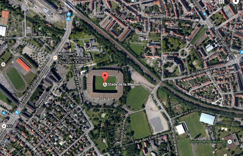 Après un âpre combat juridique, c’est un autre club, le Fussball Club Neudorf, renommé Racing Club de Strasbourg en 1919, qui signe, un peu avant la déclaration de guerre de 1914, un bail pour l’utilisation de cette prairie entourée de jardins familiaux. A cause de la guerre, il faut attendre 1921 pour que la première tribune en bois, avec places assises, soit construite. En 1930, en face, une deuxième tribune permet d’accueillir des supporteurs debout – c’est là désormais que bat le cœur de ce que l’on commence à appeler « le stade de la Meinau ».