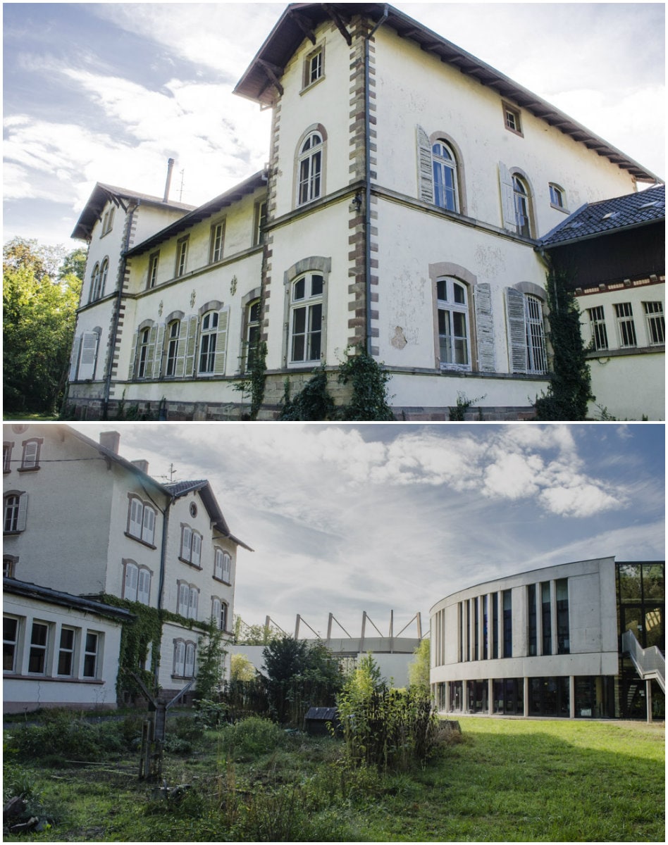 De l’entrée, à hauteur de la station Krimmeri-Meinau, le visiteur a du mal à imaginer l’écrin de verdure incroyable dans lequel s’épanouissent bâtiments ancien (1871-77) et moderne (2006). La nature est présente partout, dans un parc, un petit jardin partagé, un friche épineuse. Le tout, avec vue sur les arcs en béton du stade.