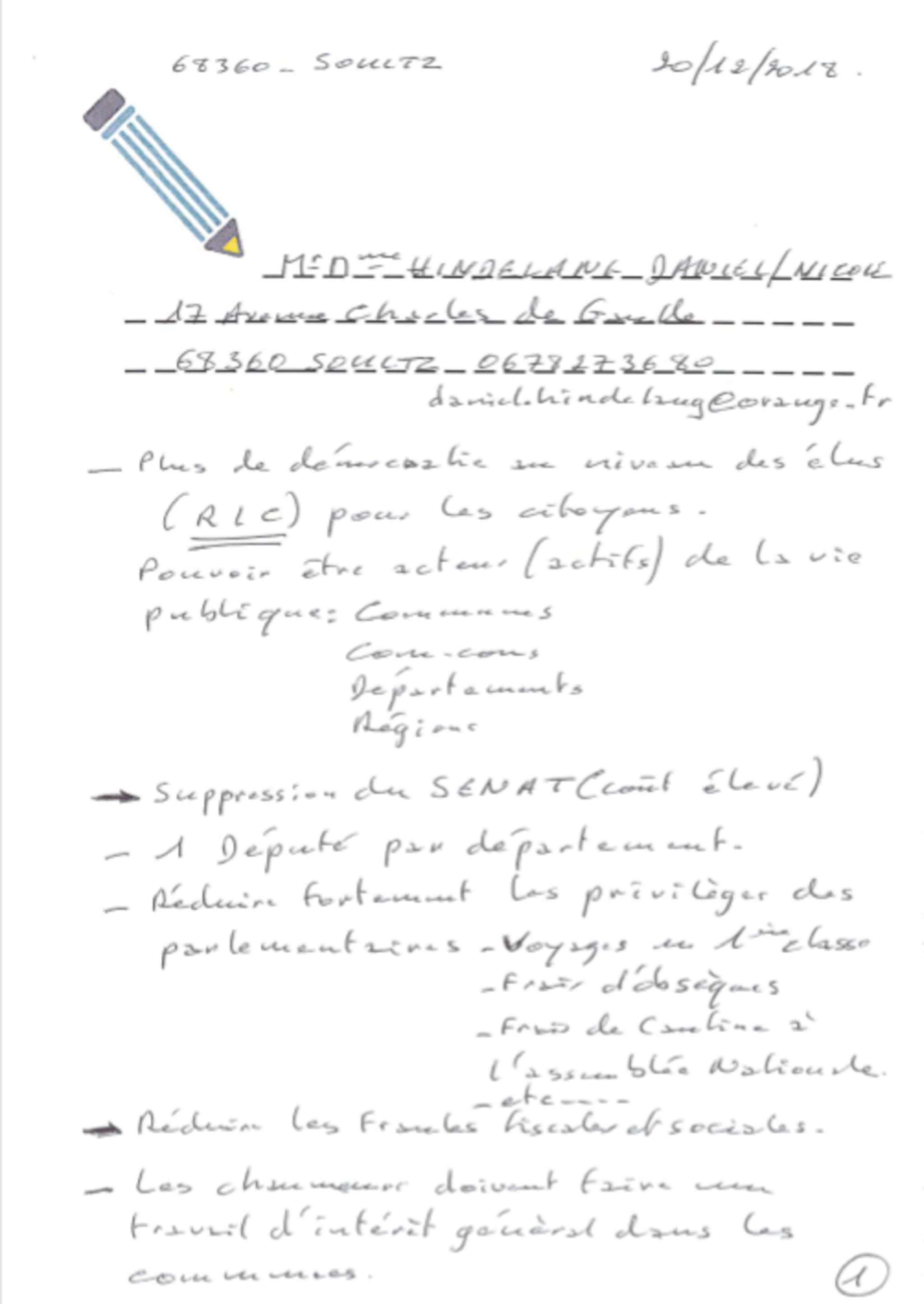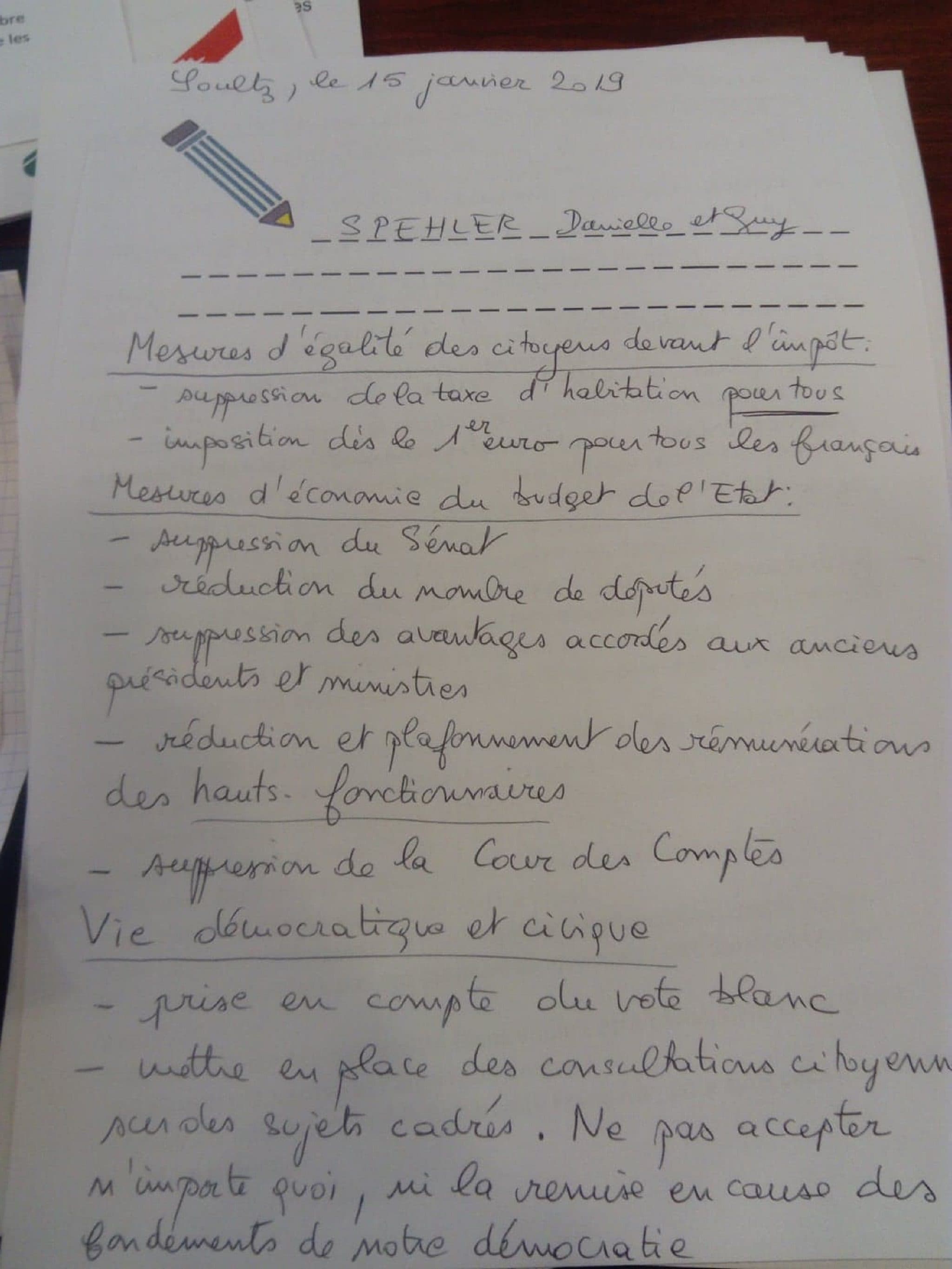 Ainsi, Elio Rinaldi, porte-parole des Gilets jaunes de Soultz a déposé une synthèse des revendications. Une poignée d’autres membres du mouvement ont déposé des contributions. Un autre signataire a, au contraire, demandé expressément de ne pas accéder à certaines demandes politiques du mouvement (pas de démission de Macron, pas de Référendum d’initiative citoyenne, pas de nouvelle Constitution et que Macron continue en son programme « en tenant compte des doléances réalistes » comme le rétablissement de l’impôt sur la fortune, l’ISF).