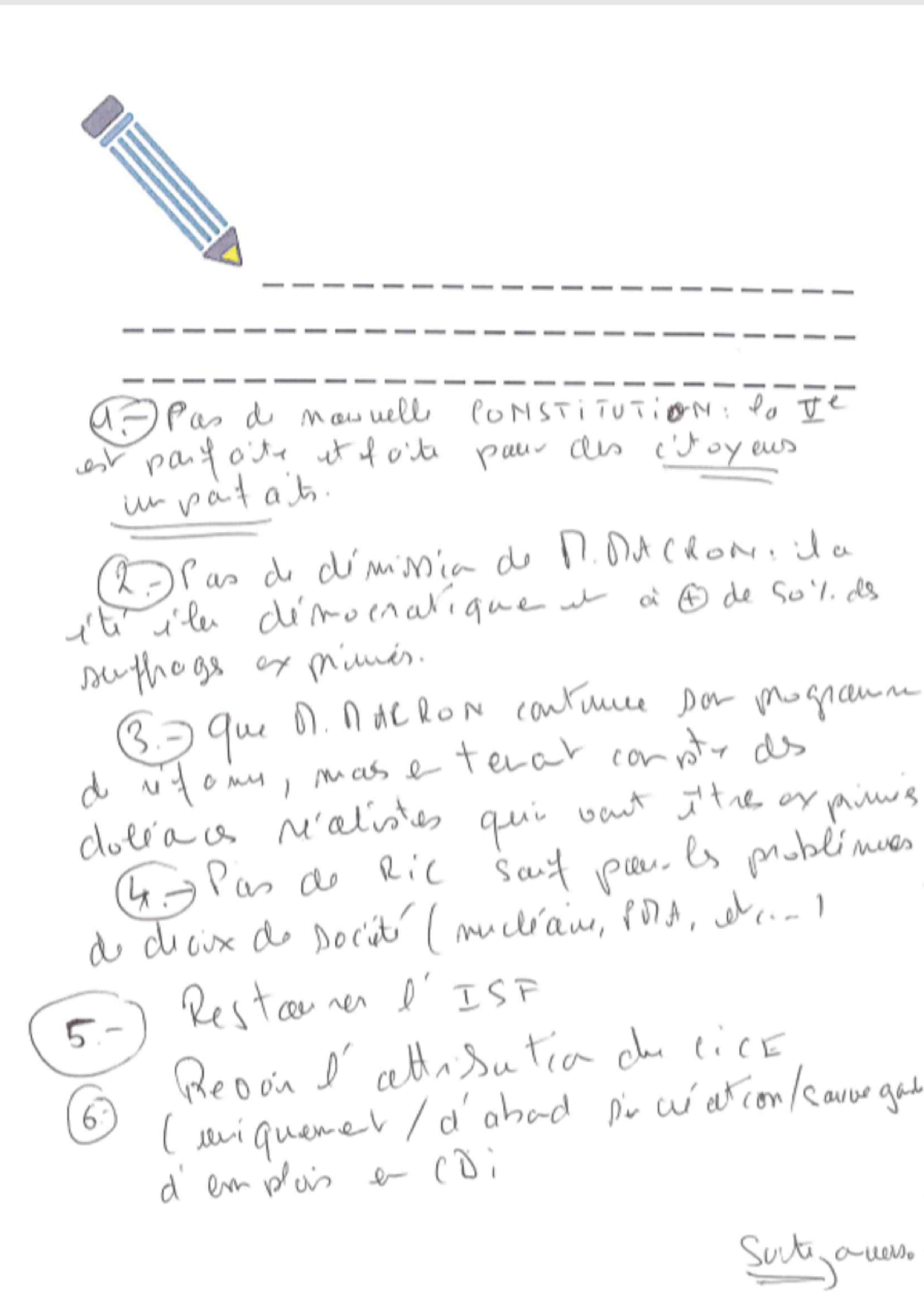 L’autre sujet récurrent inscrit dans le cahier doléances de Soultz est le pouvoir d’achat. Sont demandés, une baisse des taxes sur l’essence et la consommation, ainsi que l’augmentation des retraites plutôt qu’une hausse des salaires. La fiscalité et sa redistribution concentrent les préoccupations. Seule une doléance d’Elio Rinaldi évoque une hausse du SMIC et des salaires en général. Le retour de lSF est quant à lui aussi mentionné par cinq citoyens.
