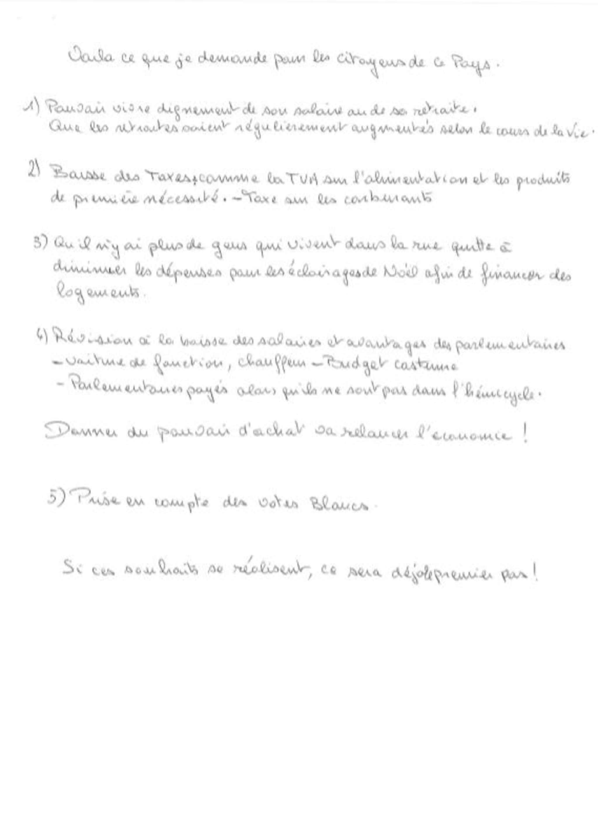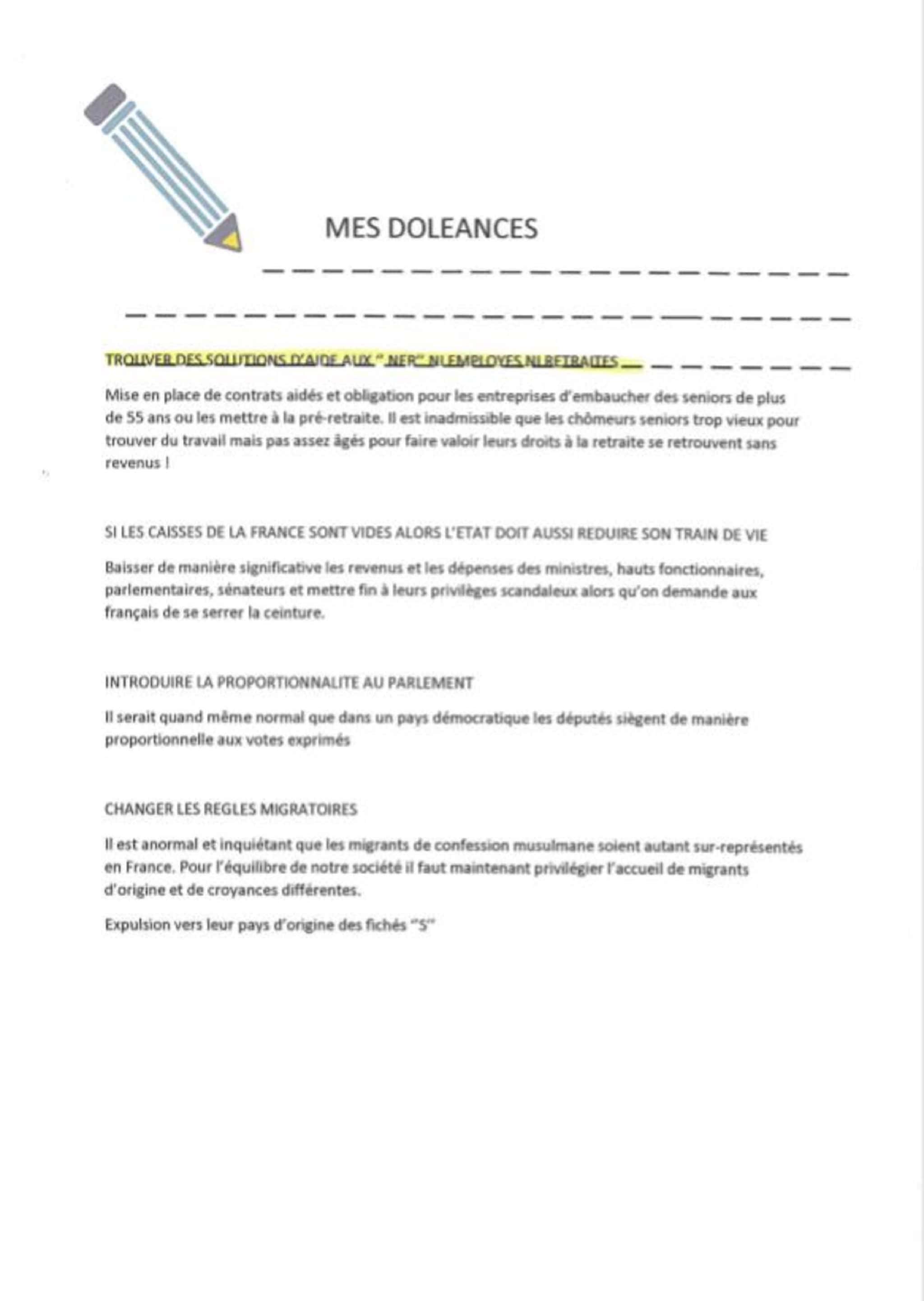 Sur les vingt doléances que compte le cahier, deux d’entre elles seulement abordent le sujet de l’immigration. Pour l’une, il faudrait « privilégier l’accueil de migrants de confession non-musulmane » et « expulser les fichés S dans leur pays d’origine », pour l’autre « la fin du droit du sol, la déchéance de nationalité et la fin des aides sociales accordées aux migrants ». Des propositions inspirées par les programmes politiques de l’extrême-droite.