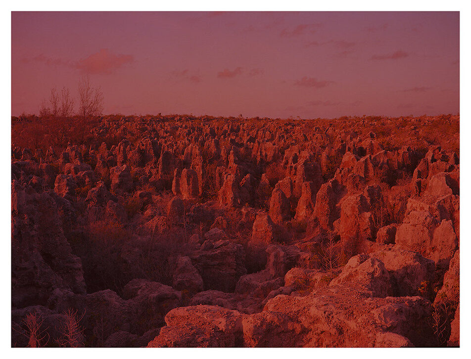 Le phosphate, devenu part entière du décor insulaire, se répand jusqu’aux négatifs de Richard Pak. Ceux qui ont capturé les gisements de son ancienne exploitation sont plongés dans une solution d’acide phosphorique. La technique du trempage emplit le cliché d’un rouge vermillon. En renversant des gouttelettes d’acide, le résultat est tout aussi bluffant, avec l’apparition sur le cliché d’un dôme de taches écarlates flottant au-dessus de l’État insulaire.