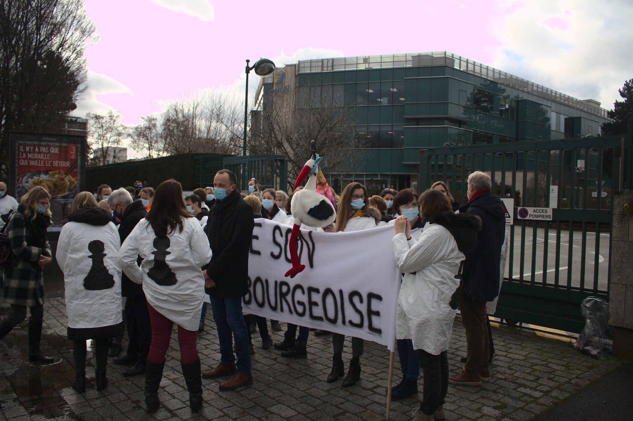 « Il y a un appel à la grève de la CGT à Sanofi France, mais aujourd’hui à Strasbourg, c’est bien une action des salariés », précise Anne Eschbach, elle-même élue CGT à Strasbourg. En effet, rue d’Ankara, pas de drapeaux syndicaux ou de tracts estampillés. En guise d’étendards : la banderole « Sanofi sacrifie son excellence strasbourgeoise » – déjà sortie lors d’une action le 1er octobre, une cigogne en peluche et des blouses blanches.