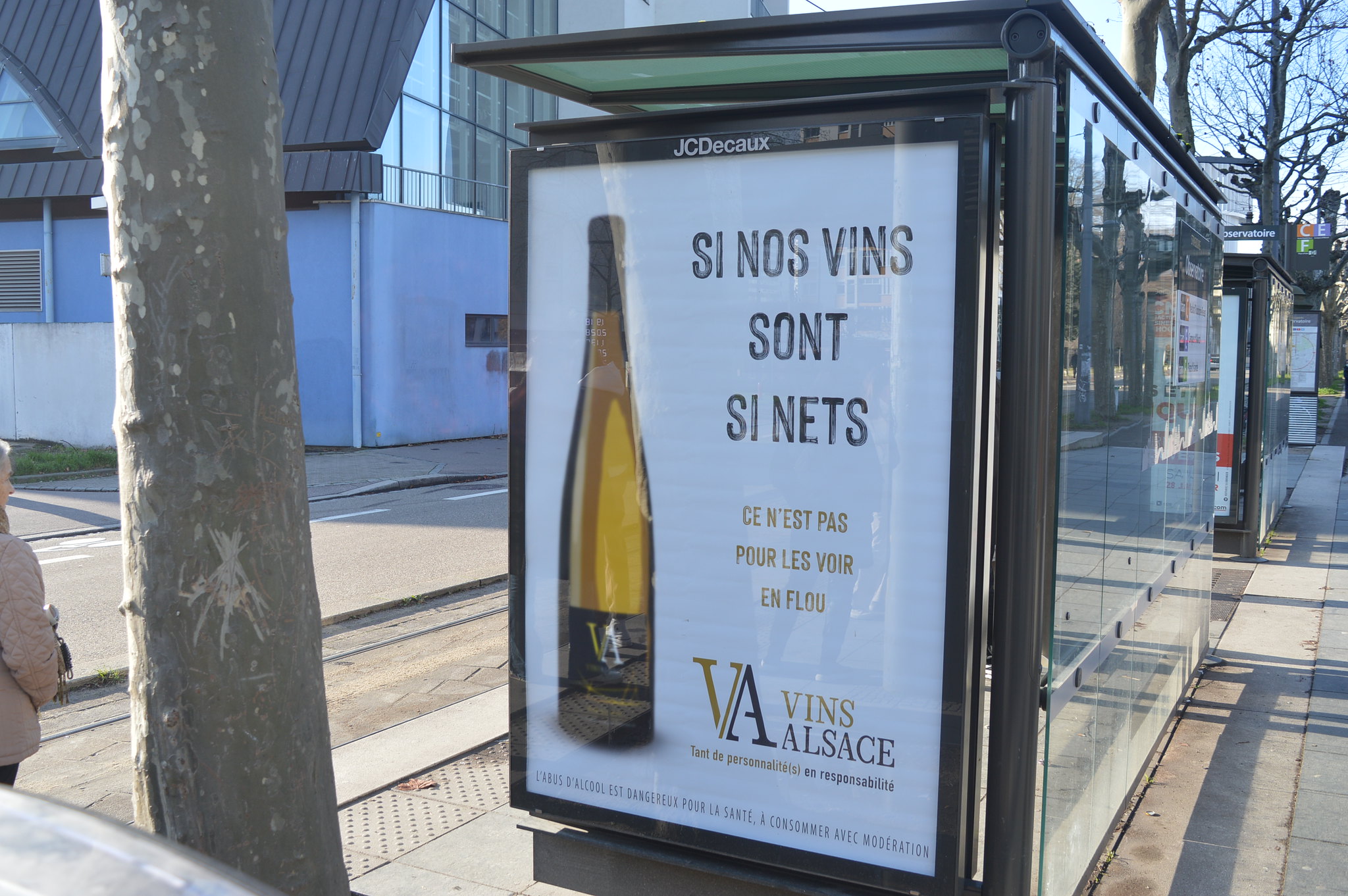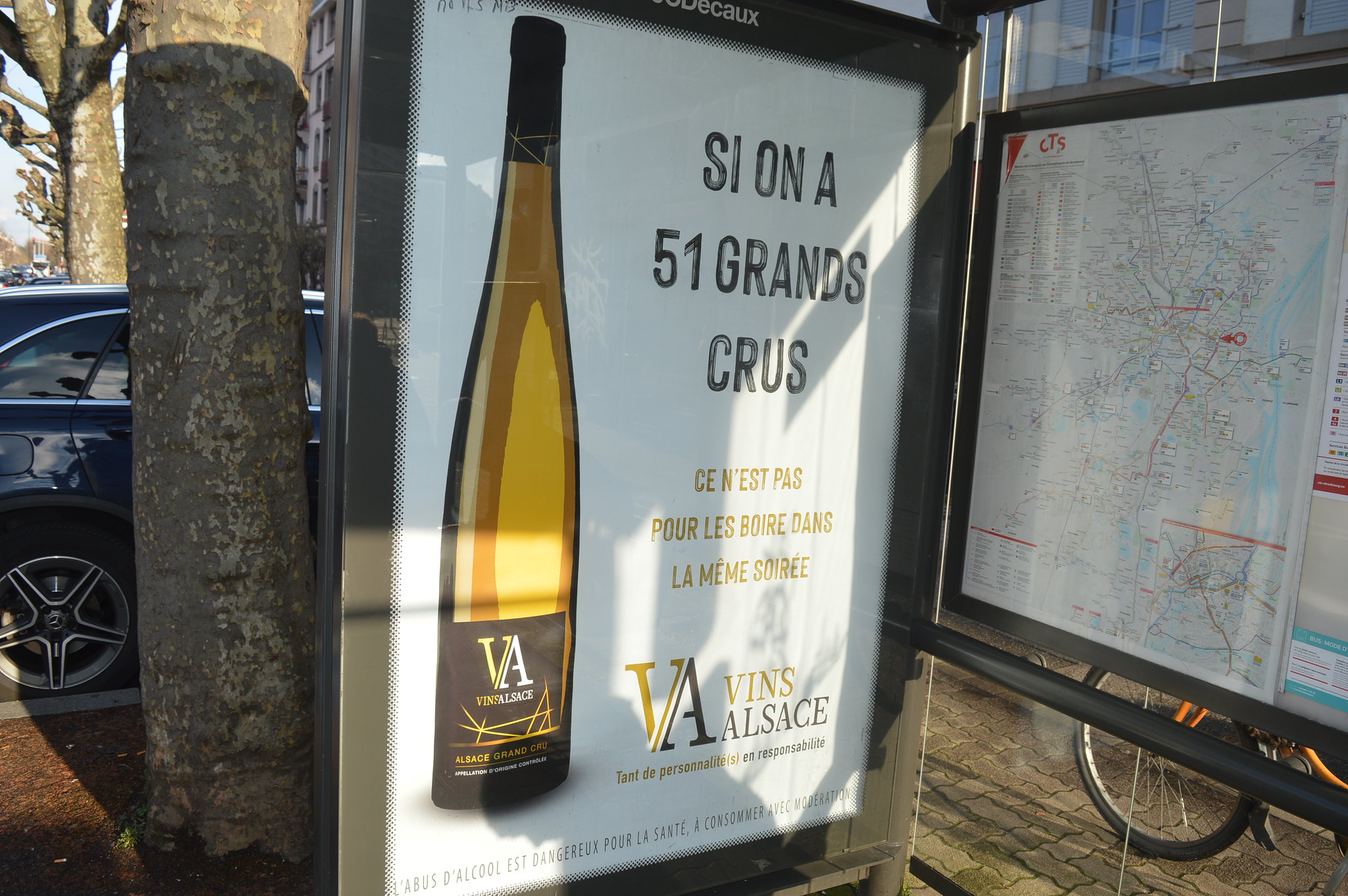 Depuis début janvier, dans 30 villes de France, on peut tomber sur les 9 000 affiches publicitaires du Conseil interprofessionnel des vins d’Alsace (Civa), avec des messages qui semblent encourager la modération dans la consommation d’alcool : « Si nos vins sont si uniques, ce n’est pas pour les voir en double », « Si on a 51 grands crus, ce n’est pas pour les boire dans la même soirée ». Les nouveaux slogans du lobby du vin alsacien sont aussi visibles dans la presse magazine et sur les réseaux sociaux.