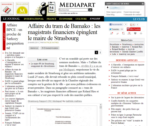Le journal en ligne Mediapart revient sur l’affaire du tramway de Bamako, à l’occasion de la publication lundi d’un rapport de la chambre régionale des comptes pointant des irrégularités sur l’attribution de certains marchés publics, notamment deux études attribuées au cabinet Roland Boehler, l’une sur un tramway à Bamako, l’autre sur la redynamisation du marché de Noël :