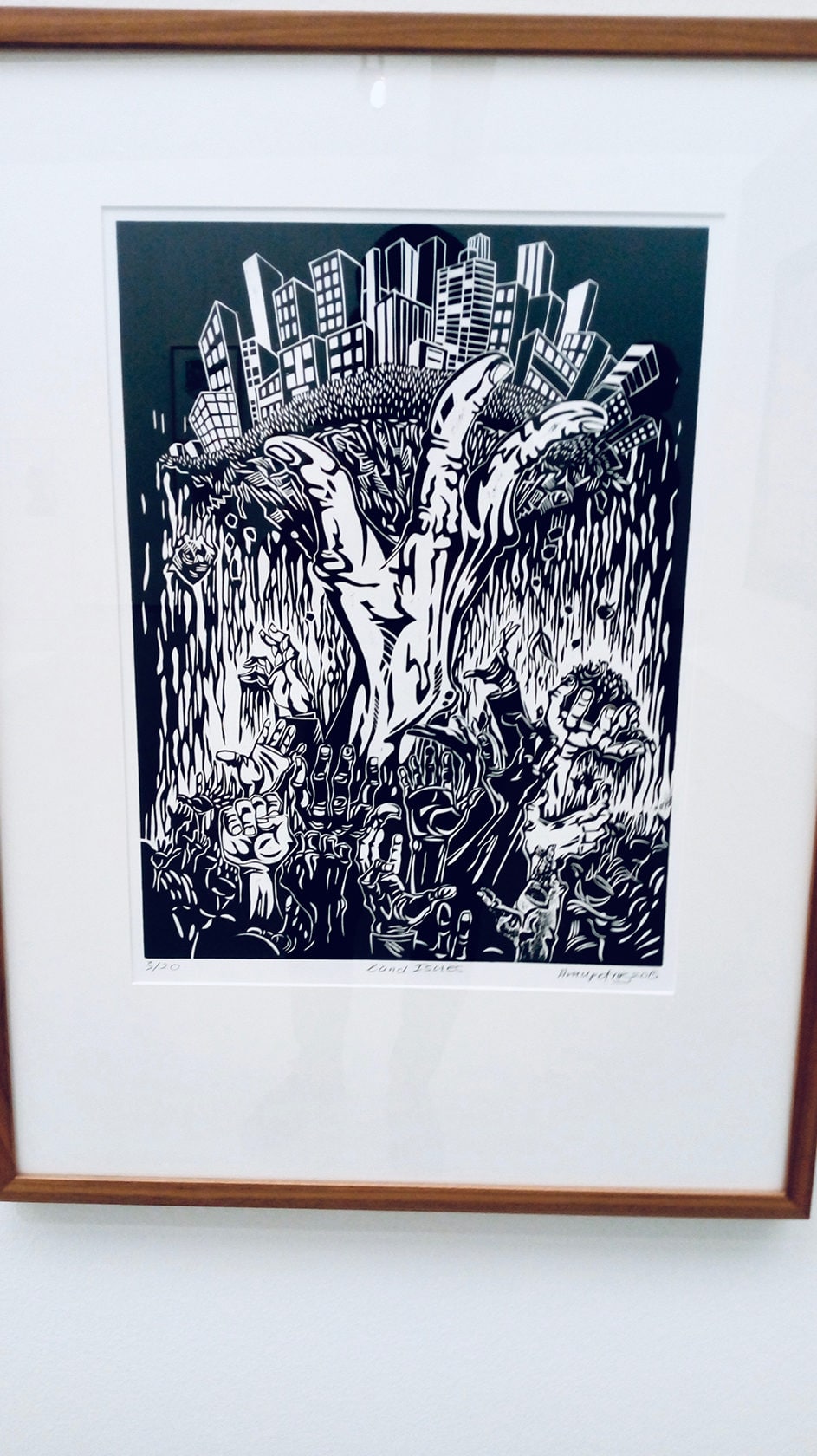La relève est notamment représentée par Petrus Amuthenu, né en 1981. La linogravure Land Issues (2015) affirme un style à la fois symboliste et urbain : un brasier de poings fermés levés dans lequel une imposante main soulève une parcelle de terre saturée de buildings. On est frappé par l’ardente intensité de l’image, par ce poing levé vers l’émancipation namibienne. Salinde Willen, née en 1987, préfère quant à elle, l’impression sur carton. Silhouette noire et casque à lampe frontale : avec The Miner (2015) l’artiste s’engouffre dans une mine aux parois d’or représentée avec minutie et détails. De la sorte, elle donne vie à des scènes du monde rural pour narrer les mœurs traditionnelles qui persistent dans la Namibie d’aujourd’hui. Comme le révèle l’exposition, la linogravure est un médium largement exploité par la scène namibienne, qui se l’approprie pour représenter des sujets sociétaux contemporains.