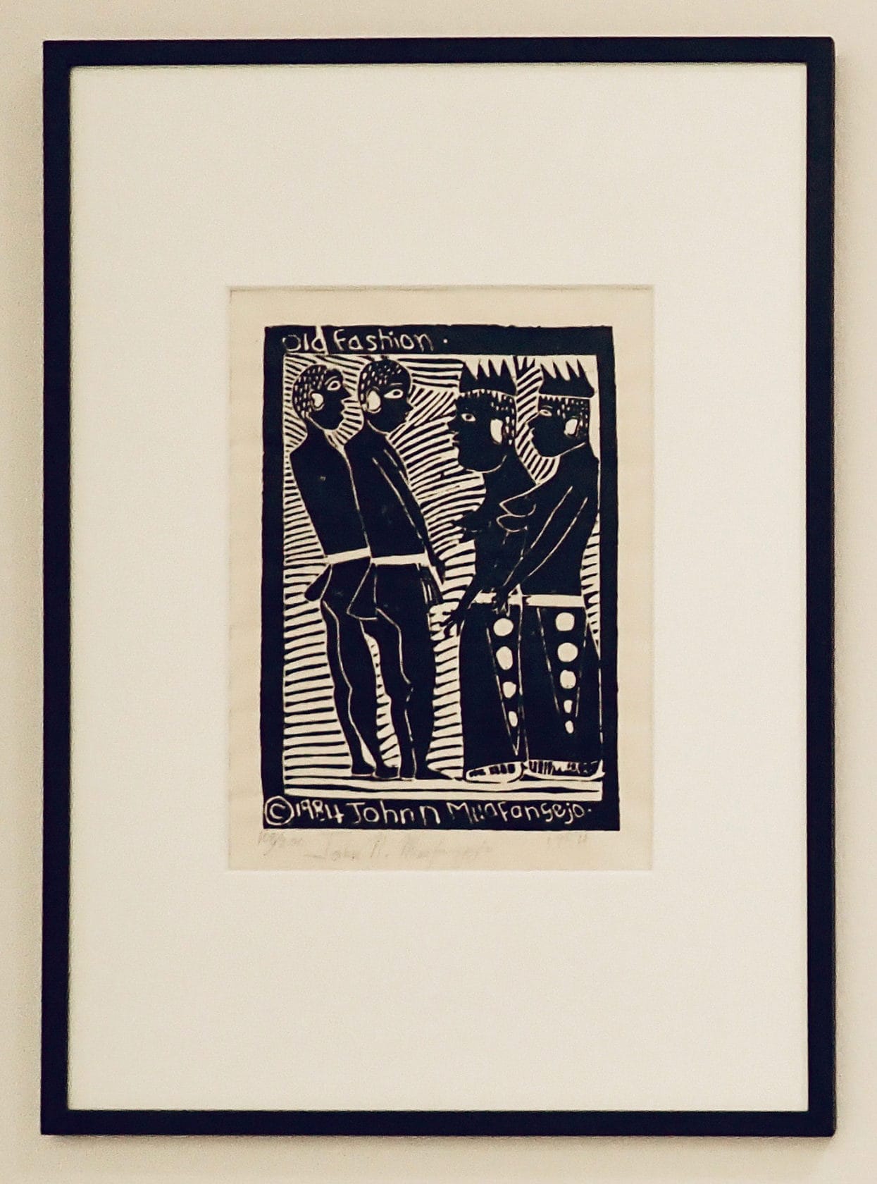 À l’entrée de l’exposition, deux linogravures de John Muanfagejo (1943-1987) résonnent d’emblée comme un héritage fondamental. Premier représentant international de l’art namibien, maître de la gravure sur lino, celui-ci incarne un modèle pour la jeune génération.