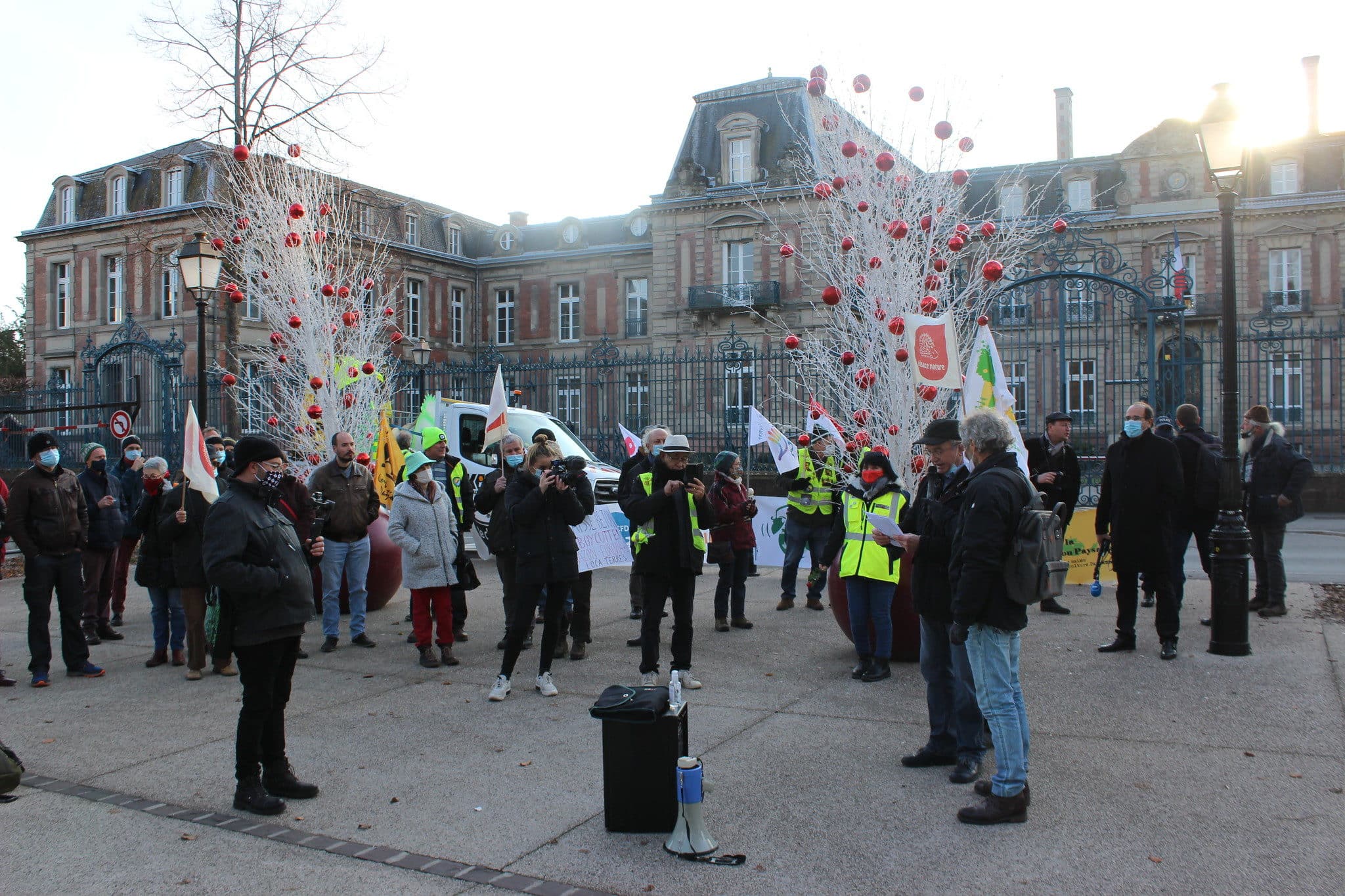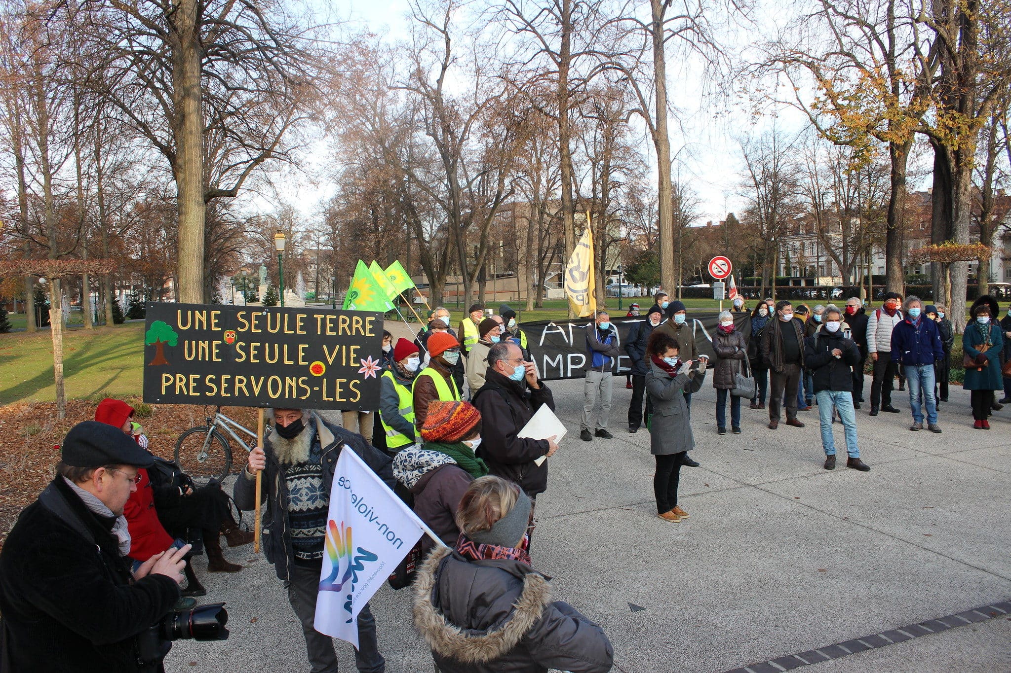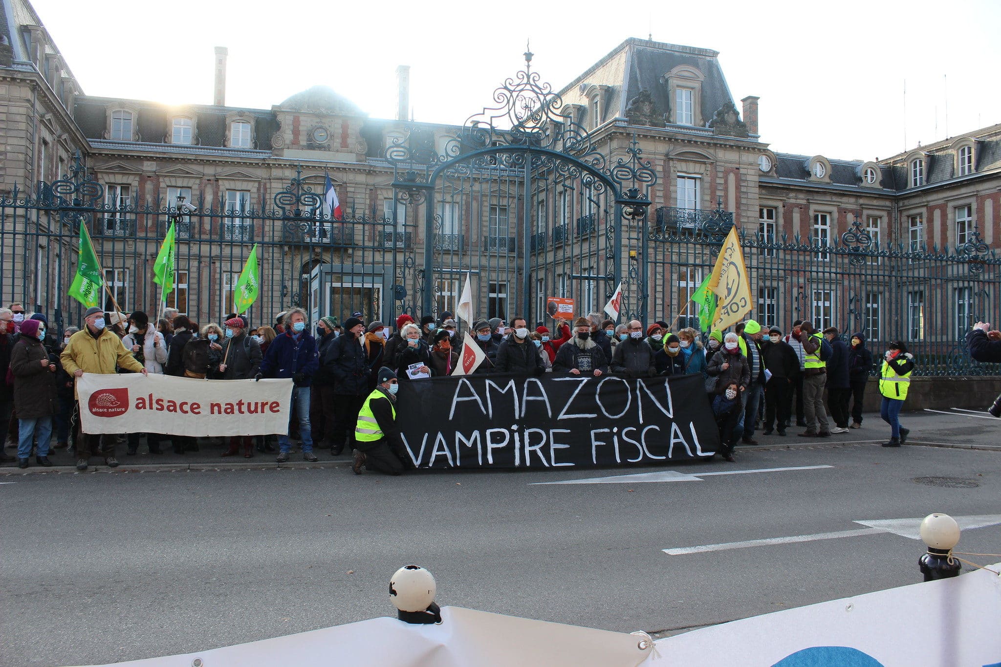 « Pas de projet en Alsace » en novembre, rime-t-il avec un nouvel entrepôt en décembre ? Environ 80 personnes étaient réunies à Colmar ce jeudi 3 décembre, convaincues qu’Amazon se cache derrière la société prête-nom Eurovia 16 à Ensisheim. C’est la troisième fois que les opposants à l’entrepôt de 189 000 m² pour le commerce en ligne se retrouvent devant la préfecture du Haut-Rhin. Malgré les dires d’Amazon, l’arrivée du géant américain ou d’un autre acteur majeur du commerce en ligne se précise.