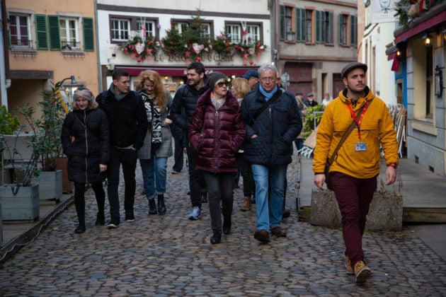 Un car plein de touristes allemands vient de quitter la place de l’Etoile. Mardi 17 décembre, 8h30, le temps presse. Dans huit heures, les visiteurs seront déjà sur le trajet du retour pour l’Ouest de l’Allemagne, entre Bonn et Cologne. La visite commence par une heure de bus avec guide touristique. L’homme au micro rappelle l’histoire de Strasbourg et de l’Alsace, entre appartenance à la France et annexion allemande : « Imaginez un Pierre Maître né en 1865 a dû s’appeler Peter Meister dès 1870 et il a encore changé de nom trois fois jusqu’en 1945. »