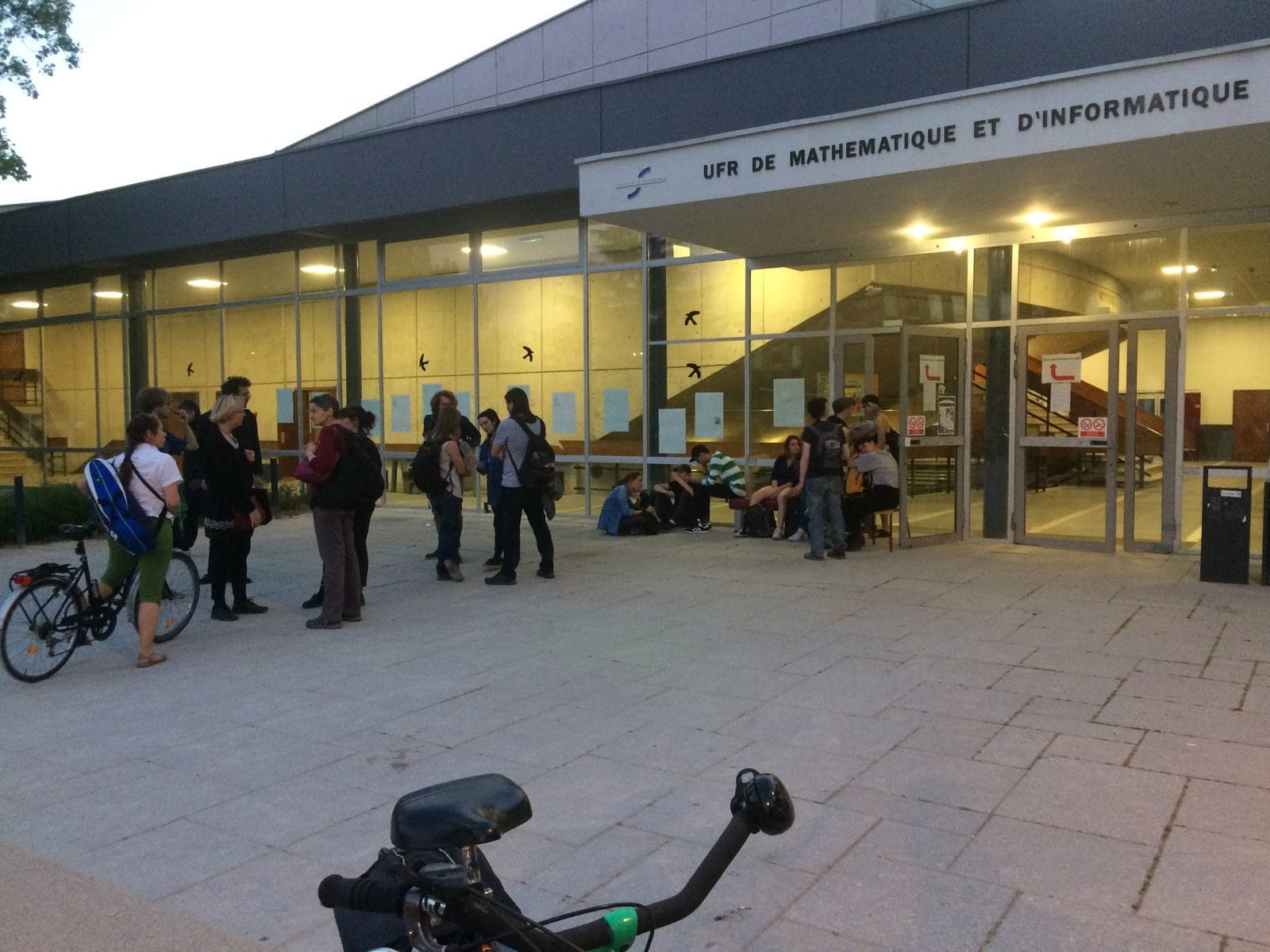 Une partie des étudiants qui ont participé à la manifestation de « convergence des luttes » jeudi ont investi un amphithéâtre de l’UFR de Mathématiques et Informatique de l’Université de Strasbourg, sur le campus de l’Esplanade à partir de 17h. Ils en sont ressortis vers 22h, alors que des CRS approchaient. La cinquantaine de policiers venait de l’Arcadia, le bar de l’association du Bastion social à l’Esplanade où se tenait une conférence avec l’eurodéputé FN Bruno Gollnisch plus tôt dans la soirée.