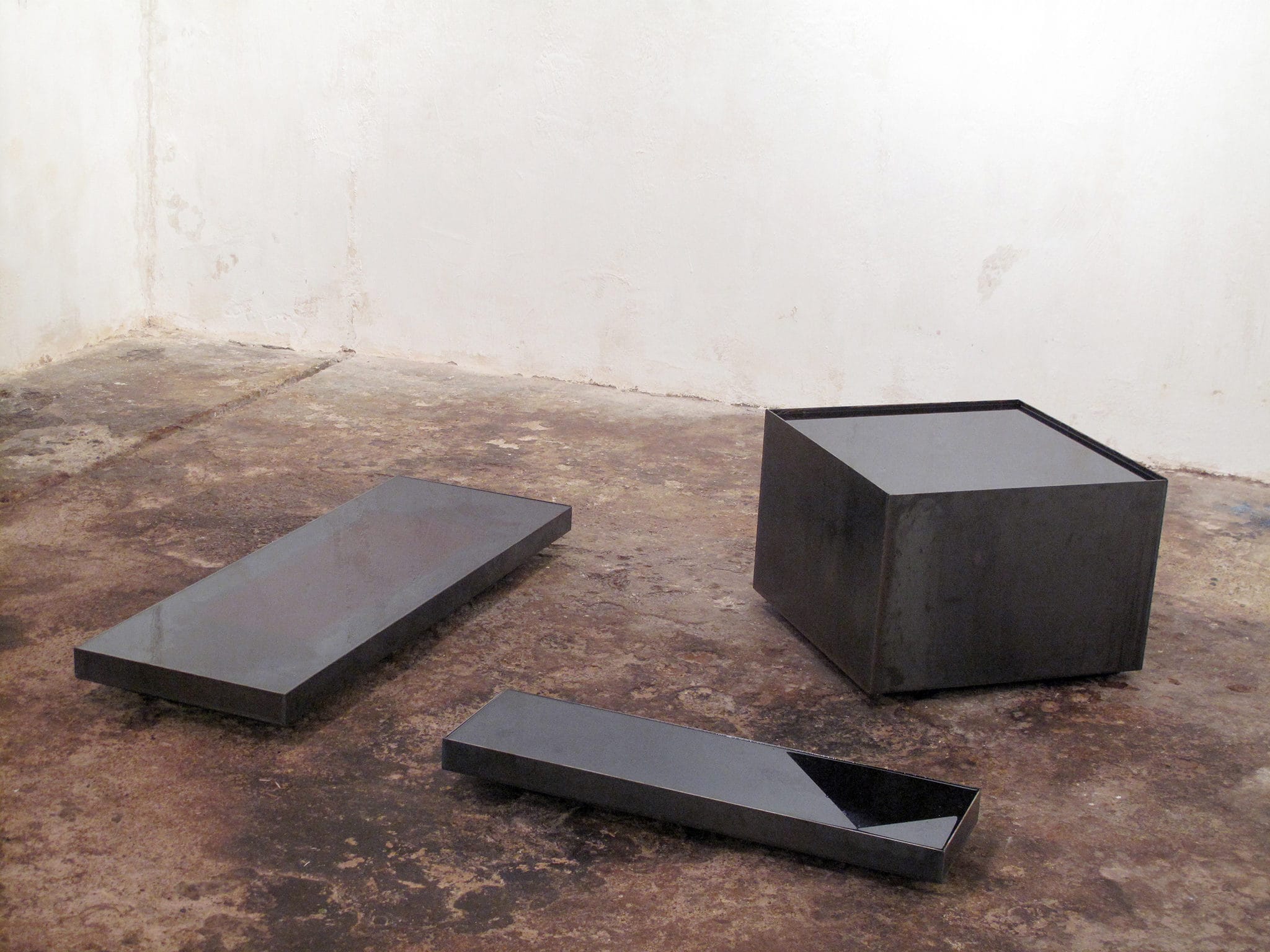 Un cas particulier est la sculpture Presque (2013), composée des bacs géométriquement très réguliers emplis de thé noir. Son installation à côté d’une fenêtre permet l’évaporation du liquide au fil des dix semaines de l’exposition, et la formation progressive d’une trace craquelée sur les surfaces métalliques des conteneurs. Cette marque devient alors l’empreinte d’un phénomène naturel contraint par des choix humains.