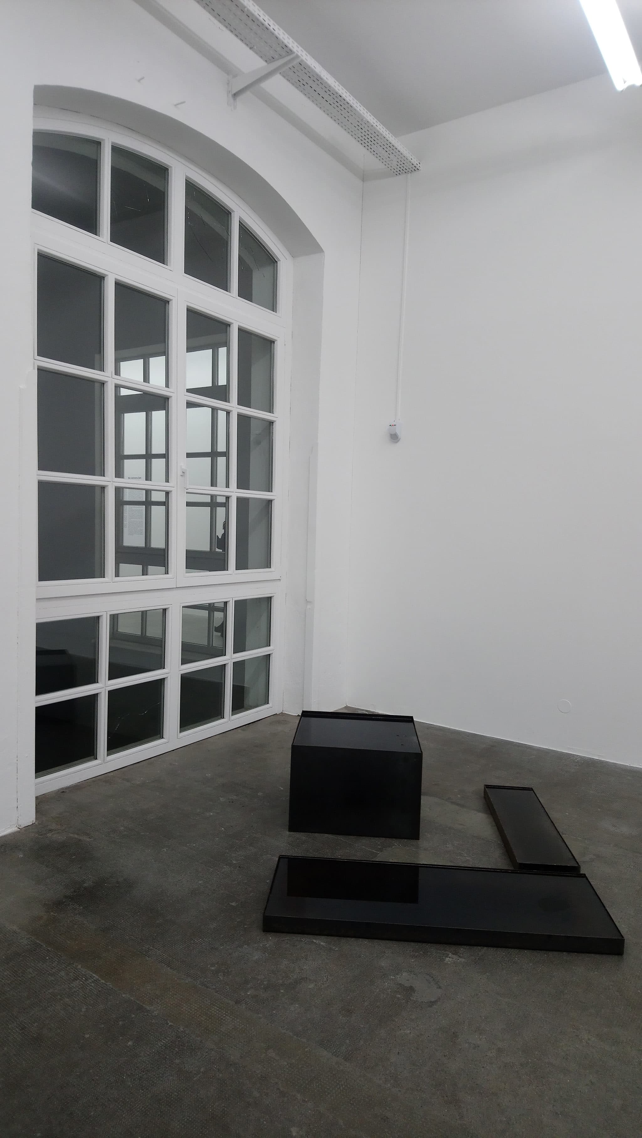 Un cas particulier est la sculpture Presque (2013), composée des bacs géométriquement très réguliers emplis de thé noir. Son installation à côté d’une fenêtre permet l’évaporation du liquide au fil des dix semaines de l’exposition, et la formation progressive d’une trace craquelée sur les surfaces métalliques des conteneurs. Cette marque devient alors l’empreinte d’un phénomène naturel contraint par des choix humains.