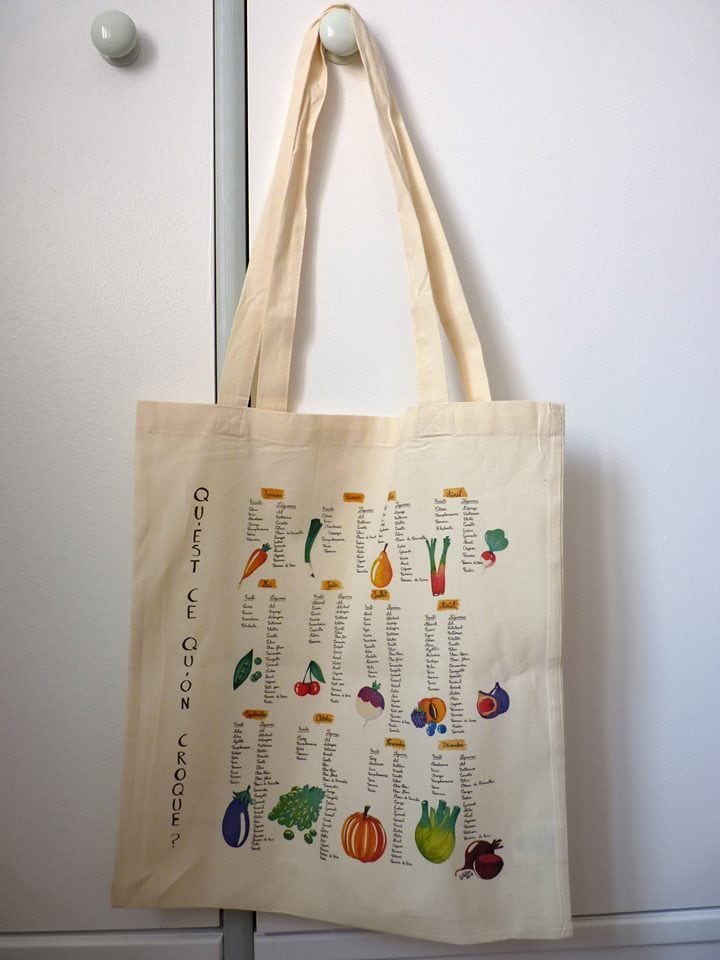 Le réseau et sa petite renommée locale, c’est aussi ce qui lui a ouvert d’autres opportunités. Des artisans lui passent des commandes, ce qui lui permet de faire des missions de graphisme. Elle s’y était déjà exercée toute seule, comme par exemple sur ce sac en coton bio qu’elle porte à l’épaule, et pour lequel elle a réalisé des illustrations de fruits et légumes :