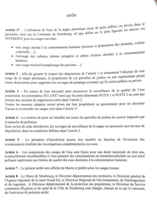 Mi-juin 2017, la Ville de Strasbourg a pris un arrêté face à « la très forte contamination de l’eau prélevée en tétrachloroéthylène » dans la zone. Selon le ministère de la Santé, ce solvant peut être toxique « pour le système nerveux et les reins et lors d’une exposition très intense, ses effets peuvent aller jusqu’à la perte de connaissance et la mort. » La Ville a ainsi suspendu tout usage de « l’eau de la nappe phréatique issue de puits publics ou privés » pour la majeure partie de ces jardins partagés qui jalonnent le reste de sud-est de Koenigshoffen.