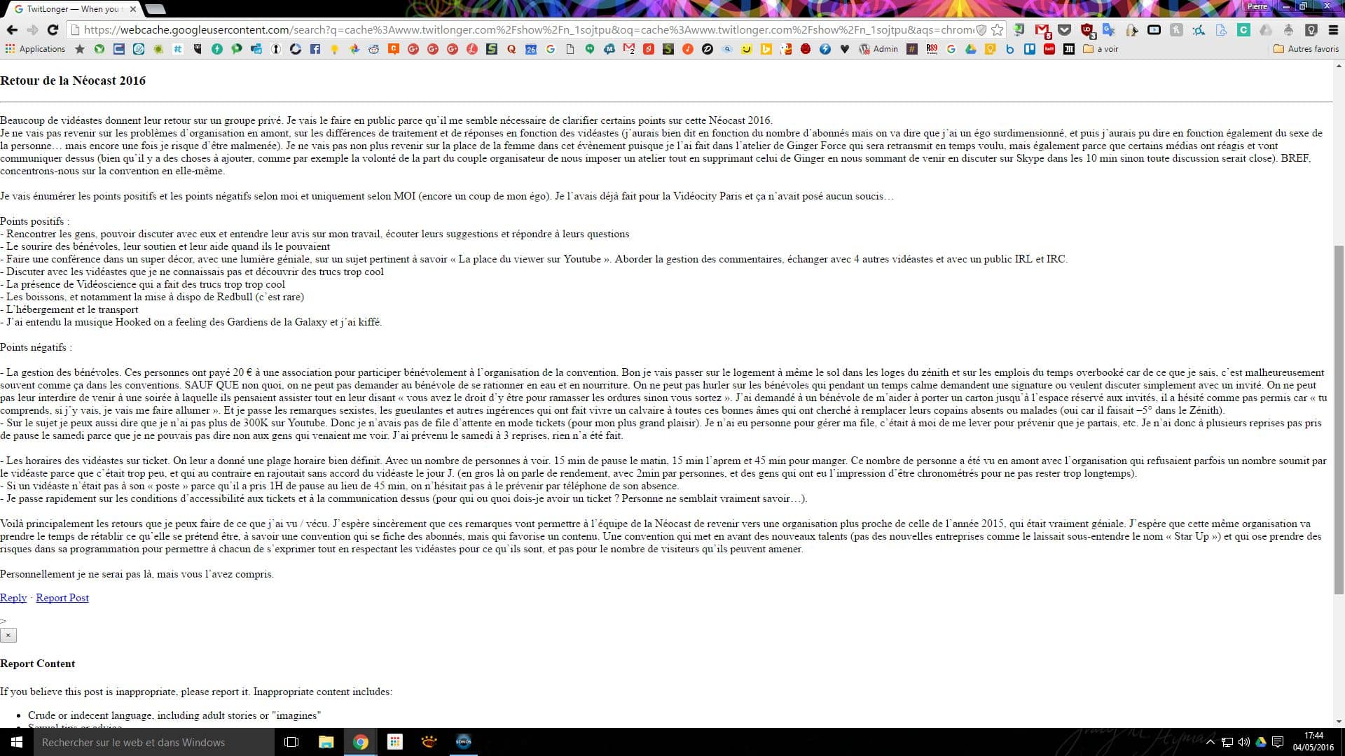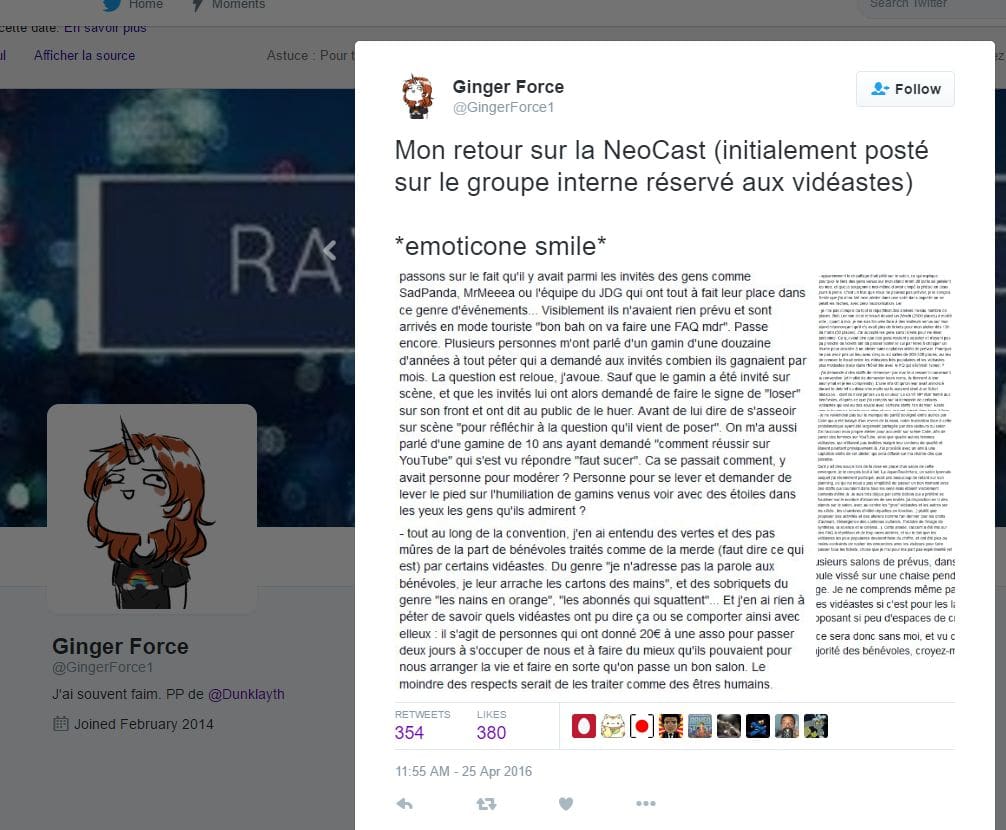 La situation des bénévoles a même attiré l’attention de certains vidéastes ayant participé à NeoCast et qui ont posté publiquement leurs ressentis. Coralie Brillaud, de Les Topauvores, résume :