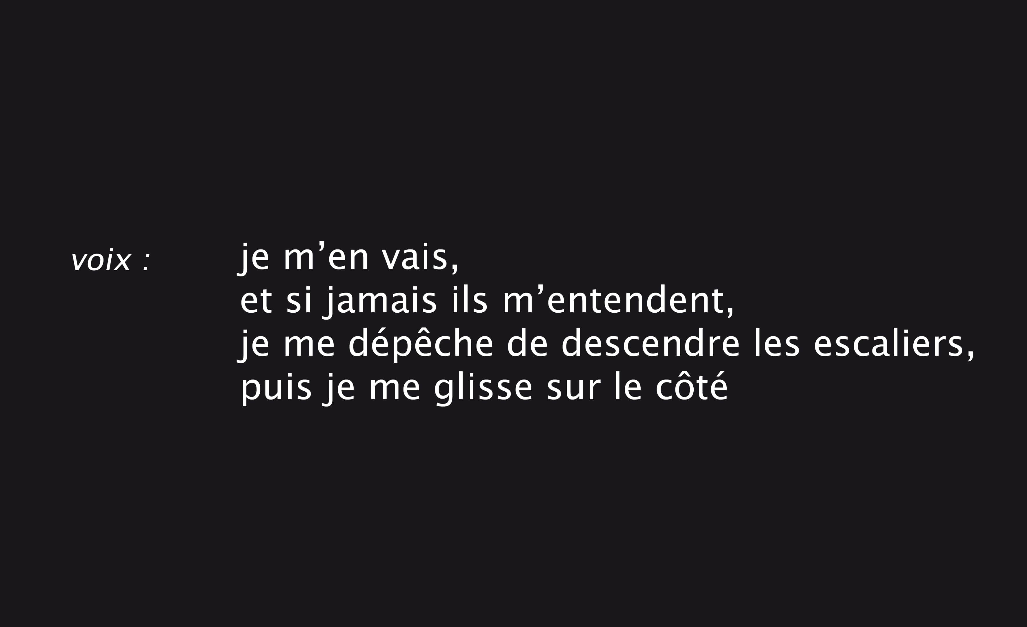 Le son circule entre les espaces et nous invite à aller à l’étape suivante. En haut de l’escalier, toutes les portes sont fermées, il faut trouver celle qui s’ouvre : celle qui mènera à l’espace suivant, au son d’après, à la suite de l’histoire ou à la prochaine peut-être aussi. Peut-être se suivent-elles, qui sait ? Dominique Petitgand a imaginé un dispositif qui nous fait passer d’un espace à l’autre dans l’ordre qu’il souhaite et pas un autre. Un peu comme un danseur qui guide sa partenaire, nous devons suivre ces voix qu’il a enregistrées, accepter de se laisser entraîner par elles.