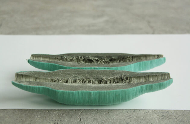 Lorsqu’on le touche, que la connexion sensuelle s’établit, la main de l’artiste va influencer la forme de la pièce en train de se faire. Une fois celle-ci séchée, Jamila procède à l’incision pour découvrir les strates de fils enfermées à l’intérieur de la bobine. Leurs formes ouvrent le champ des interprétations possibles : tantôt géodes ou concombres, les regardeurs, interrogatifs, sont songeurs.