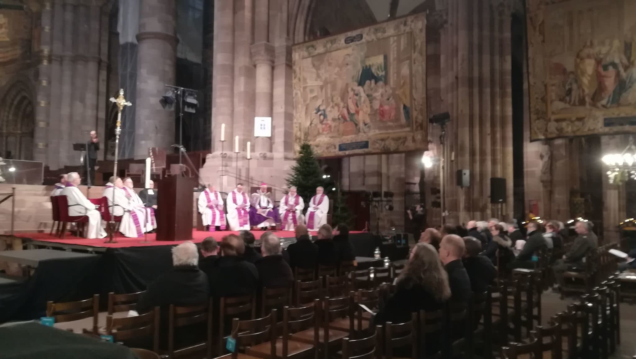 Une messe œcuménique, avec des représentants de plusieurs cultes religieux, se tient dans la cathédrale, en présence de Mgr Ravel, archevêque de Strasbourg, en mémoire des victimes de l’attaque de Strasbourg. (Photo CG / Rue89 Strasbourg / cc)