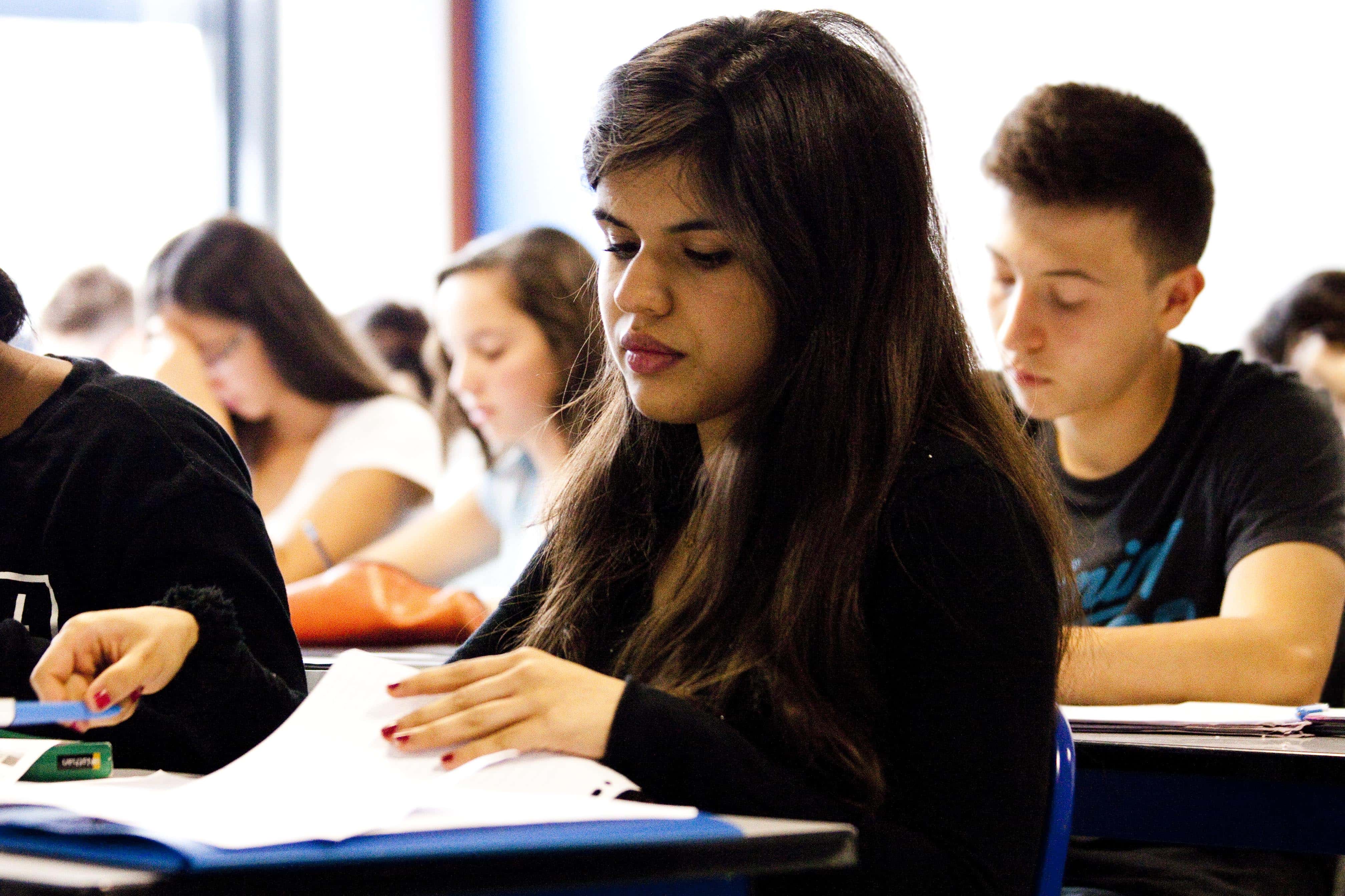 Pour leur premier cours de français de la rentrée, les 36 élèves de la première B du lycée Jean Rostand à Strasbourg sont plongés dans l’analyse de textes de théâtre. Face à leur professeur, les réponses fusent, dans une ambiance de grande concentration.
