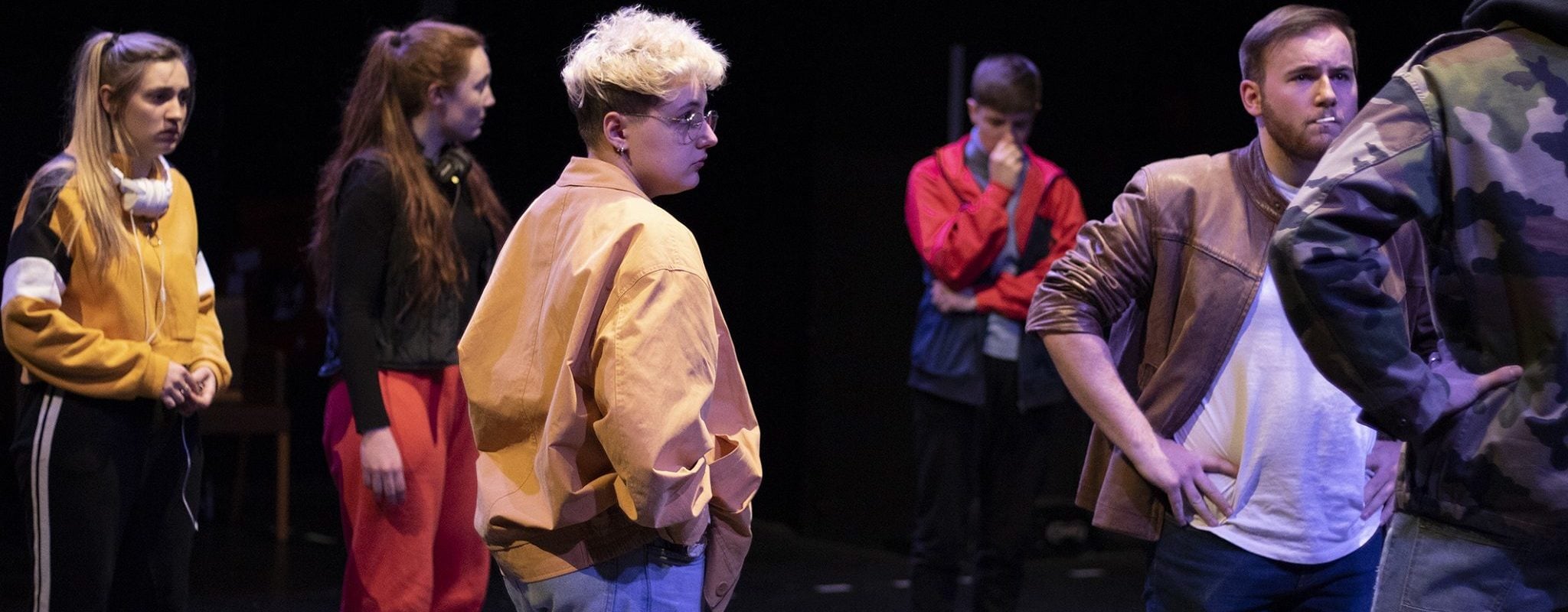 Les jeunes meurtriers Camille Girard (Jeanne), Lucie Bores (Marie), Emma Lecordier (Romy), Claire Gaborit (Cam), Rudi Berschinski (Phil) et Gabriel Seidenbinder (John Tate) hésitent sur la marche à suivre. (photo de répétitions remise par le TAPS)