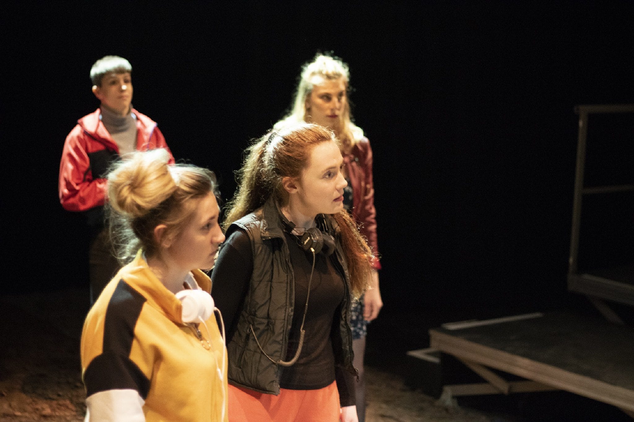 Claire Gaborit (Cam), Camille Girard (Jeanne), Lucie Bores (Marie) et Mélisende Marchand (Cathy). (photo de répétitions remise par le TAPS)