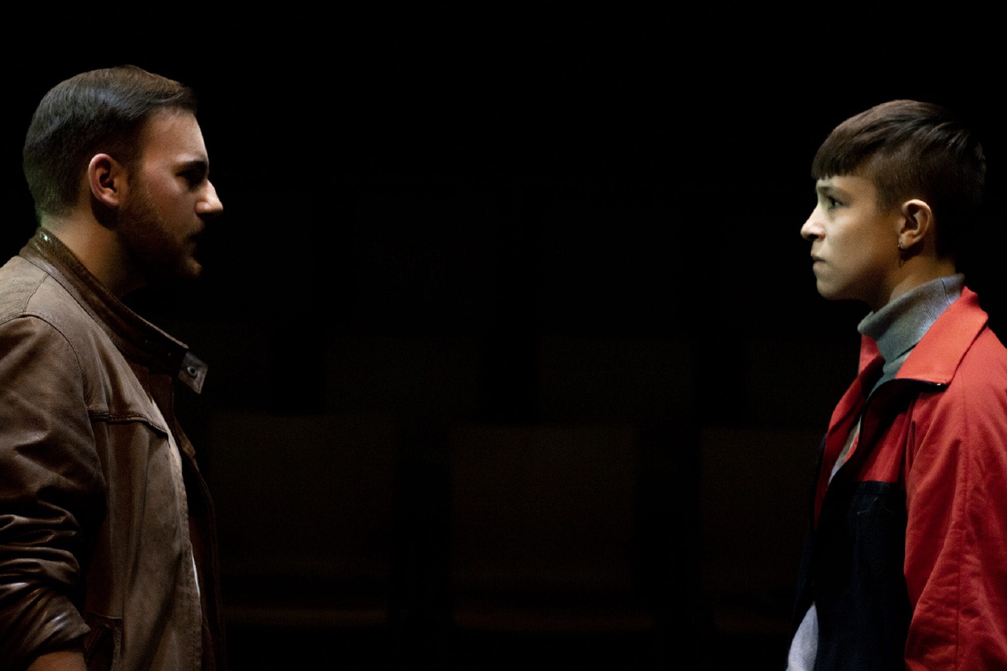L’espace est en bifrontal, avec le plateau pris entre les deux rangs des spectateurs. La mise en regard du public face à lui-même rappelle constamment le caractère artificiel du spectacle. C’est un garde-fou dans une histoire qui brouille les frontières du réel. La bifrontalité est très courante dans le théâtre contemporain, mais c’est la première fois qu’Olivier Chapelet s’y essaye :