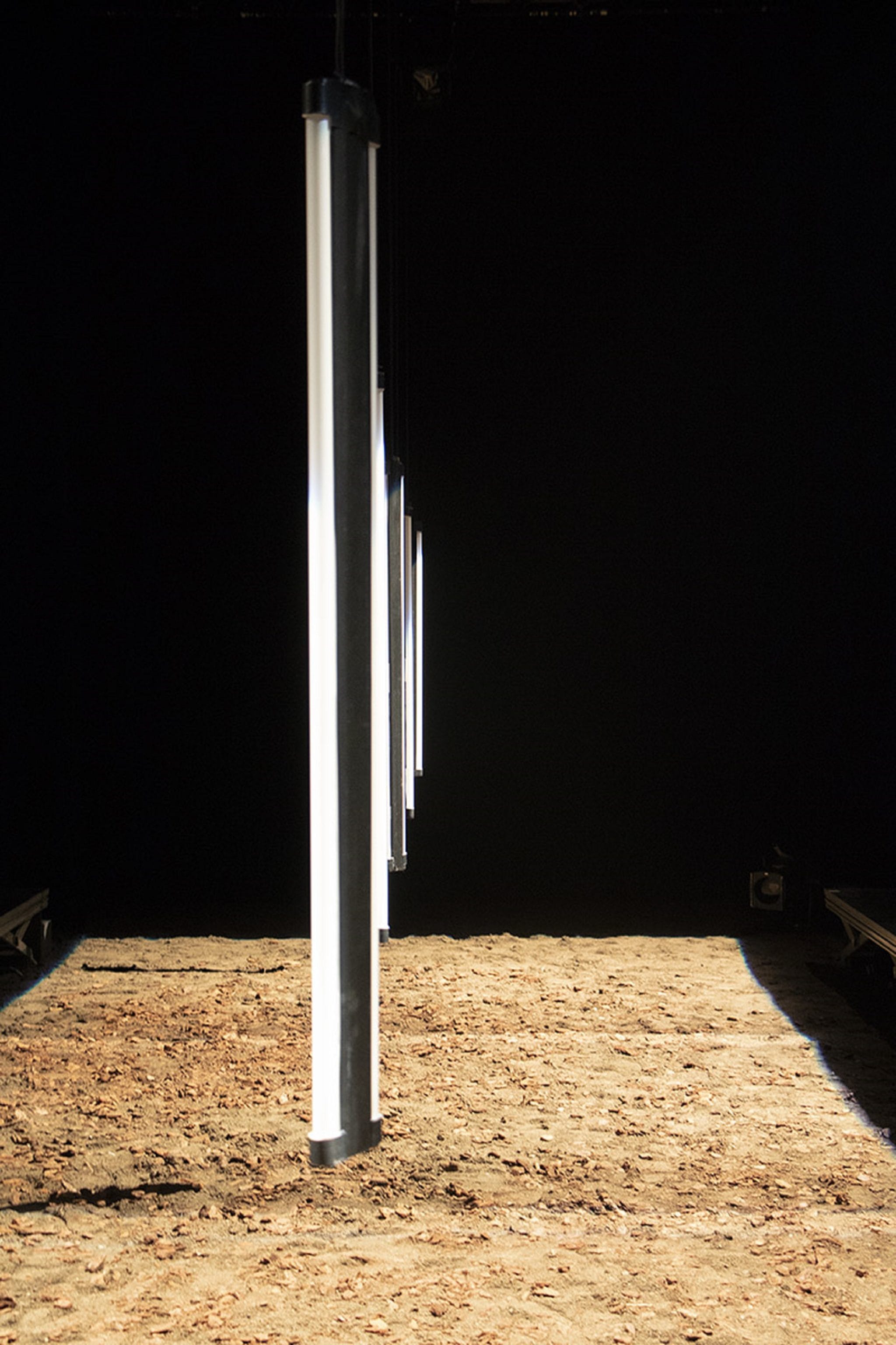 La scénographie présente des tubes luminescents pouvant descendre sur la scène. (photo de répétitions remise par le TAPS)