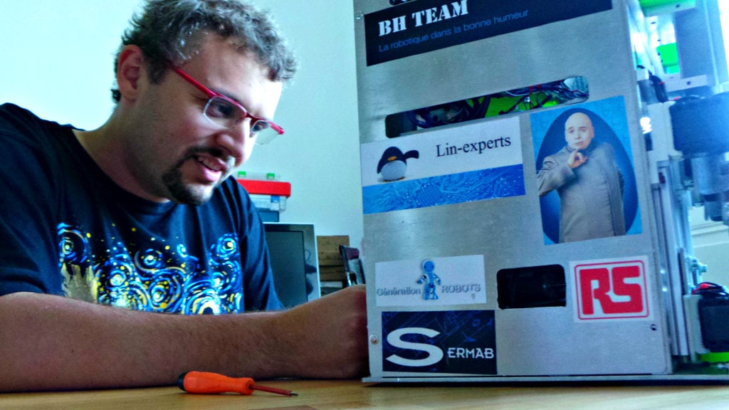 Il arrive un peu en retard et s’excuse dans un grand sourire. Le pas pressé, il porte deux lourdes caisses en bois de estampillées « BH Team », du nom de l’équipe avec laquelle il concourt depuis neuf ans à la coupe de France de robotique.