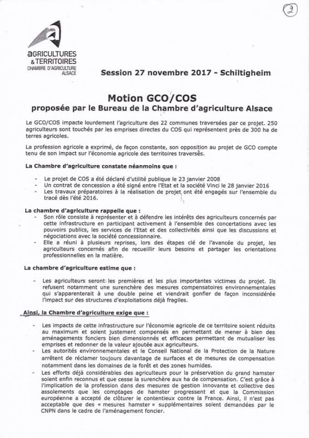 Le 27 novembre 2017, c’était au tour de la Chambre d’agriculture, organisme dirigé par la FDSEA (par le biais d’élections) de formaliser sa position à travers une motion.