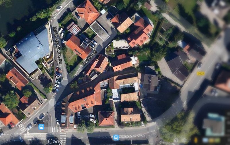 A part le hameau du Fuchs-am-Buckel, non loin de là sur la route de la Wantzenau, il n’y a pas plus septentrional à Strasbourg. La Cité des Chasseurs, située à l’extrémité nord de la Robertsau, est tout aussi invisible pour les non-initiés que le début de la voie qui y mène depuis près d’un siècle, la route des Chasseurs. Cette route démarre juste avant le tournant de la clinique Sainte-Anne, derrière l’arrêt de bus (15a et 30) et la boulangerie. D’abord réservée aux piétons et cyclistes, la route longe le Muhlwasser, qui se jette dans l’Ill peu après, à hauteur de l’intersection avec la rue Fischacker (ou « champs de poissons », nom du lieu-dit au XIXème siècle).