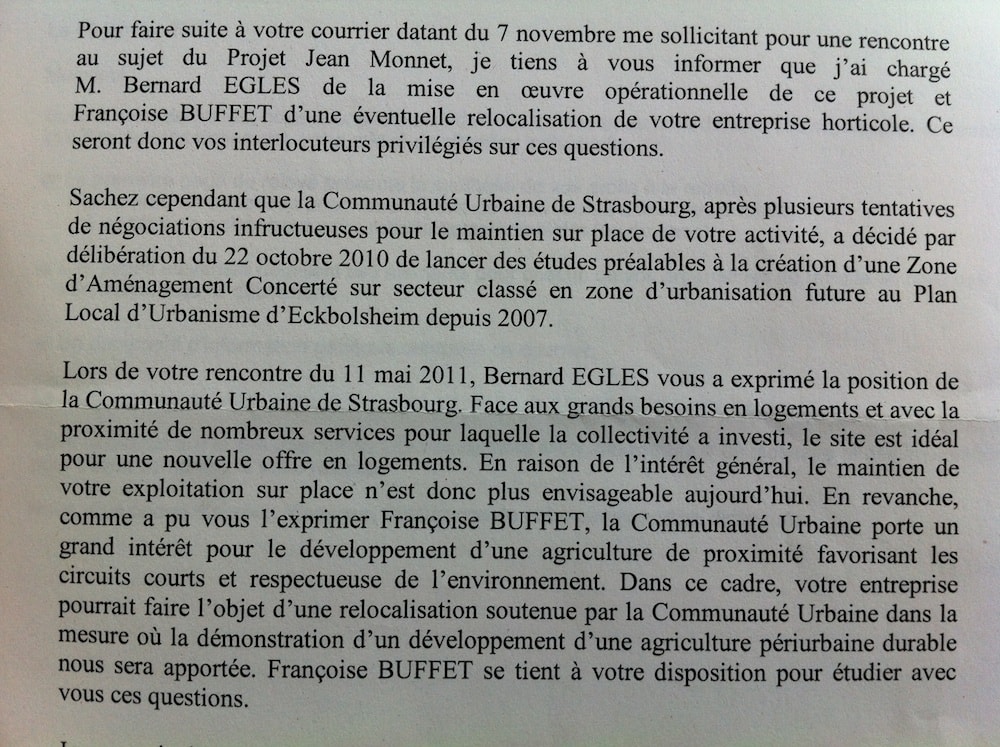 « Ce projet de ZAC ne se fera pas ! J’irai jusqu’au bout, j’attaquerai la déclaration d’utilité publique [qui devrait être effective en 2013], l’expropriation, tout ! Aujourd’hui, supprimer des exploitations agricoles, c’est aller contre l’intérêt général ! Si Eckbolsheim manque si cruellement de logements, pourquoi étaient-ils prêts à sacrifier 70 hectares de terres pour faire le Zénith et le Parc expo ? C’est cette terre qu’ils veulent, pour des raisons purement économiques, pour faire plaisir à des investisseurs privés ! »