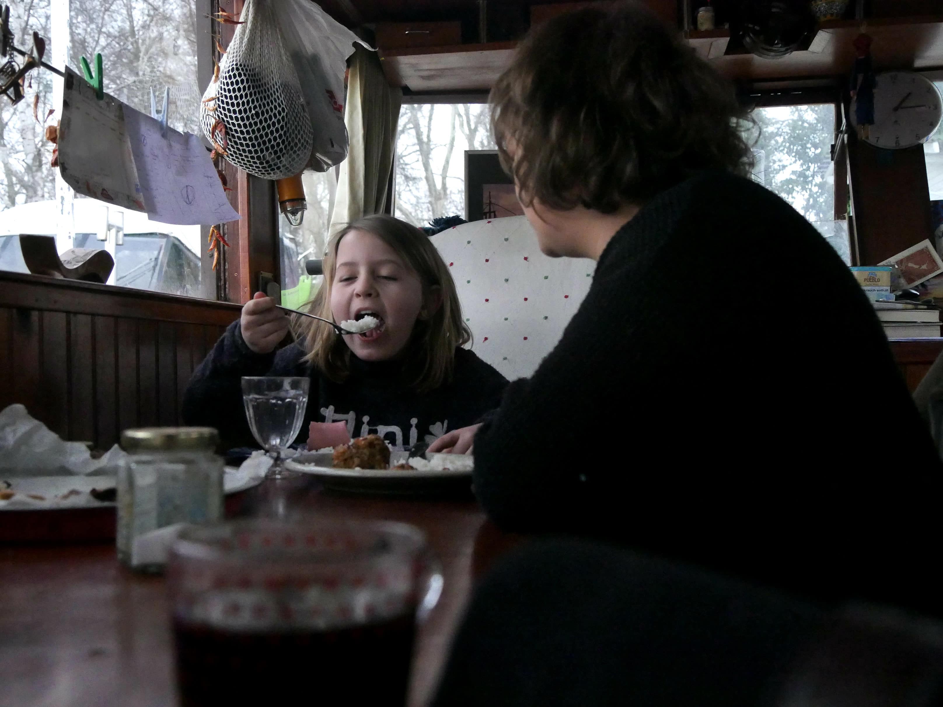 Direction « Le Passat », la péniche de Sylvain : l’entrée sur le pont se fait par une petite échelle sur le côté : il faut ensuite courber la tête pour pénétrer dans l’espace entrée-salon. Un peu en contrebas, l’espace cuisine-salle à manger : c’est un peu exigu, assez sommaire, mais fonctionnel. De l’autre côté, un petit couloir qui mène à la salle de bain (équipée de toilettes électriques), et la chambre de Sylvain. Tout est en bois ; le tout ne manque pas de charme. Étonnamment, il fait assez chaud. Le thermomètre affiche zéro degrés dehors, mais il fait bon à l’intérieur :