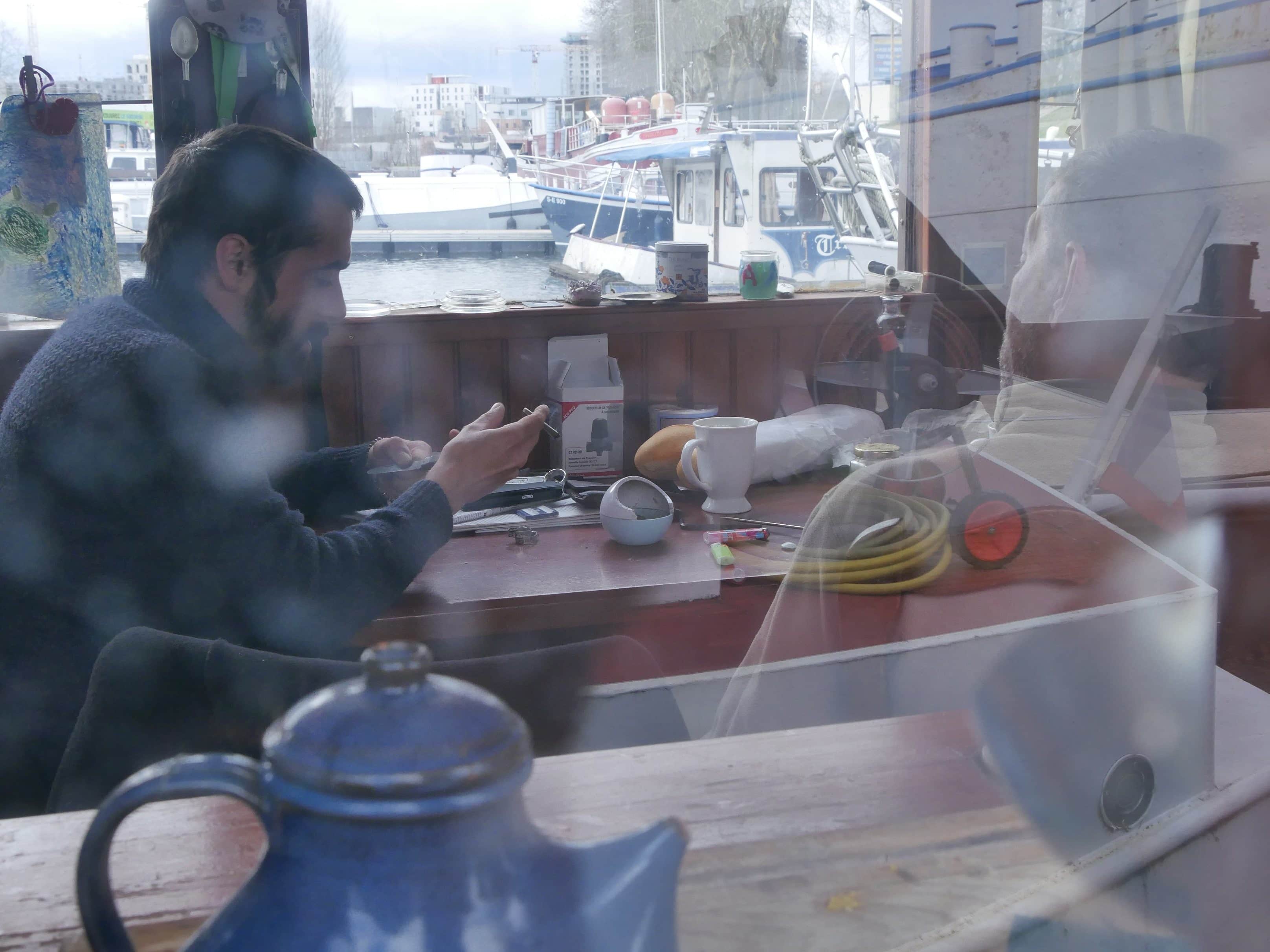 Le bateau de Sylvain est au bout des quais flottants, un peu à l’écart. « Il s’appelle le Passat, comme la voiture : ça signifie « alizé » en allemand, ça ne s’invente pas pour un bateau ! », explique-t-il dans un sourire. Il n’est pourtant pas question ici d’un voilier : Sylvain vit depuis quelques années sur ce bateau à moteur d’environ 50 mètres carrés, d’une longueur totale de 14 mètres sur 4 mètres de large. « En hiver c’est un peu exigu. Mais en été, on peut utiliser comme terrasse tout le ponton supérieur, c’est que du bonheur ! »