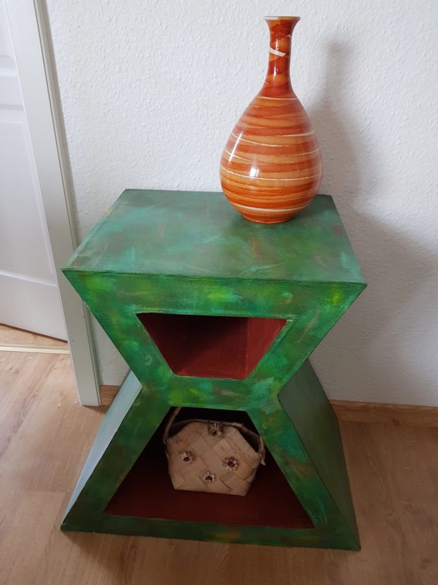 Une fois monté, elle peut livrer le meuble presque tel quel, recouvert seulement de papier kraft et vernis, ou le peindre. « L’illusion » est d’abord parfaite. Et puis, à y regarder de plus près, certaines créations présentent un aspect cartoonesque, comme si un dessin s’était glissé dans le réel.