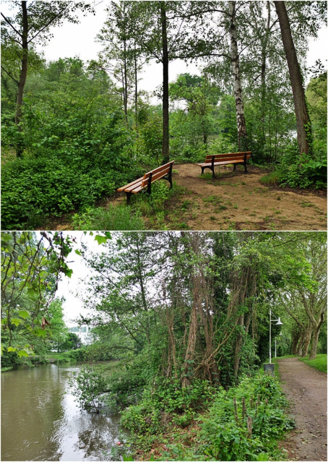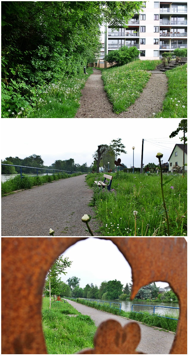 Après un rond-point, plutôt que de prendre à gauche le quai de l’Ill, prenez tout droit le long de l’eau, par le petit sentier privé (ouvert, mais « interdit aux chiens » comme beaucoup de chemins à Illkirch…) d’une résidence (sur-)équipée en terrains de tennis.
