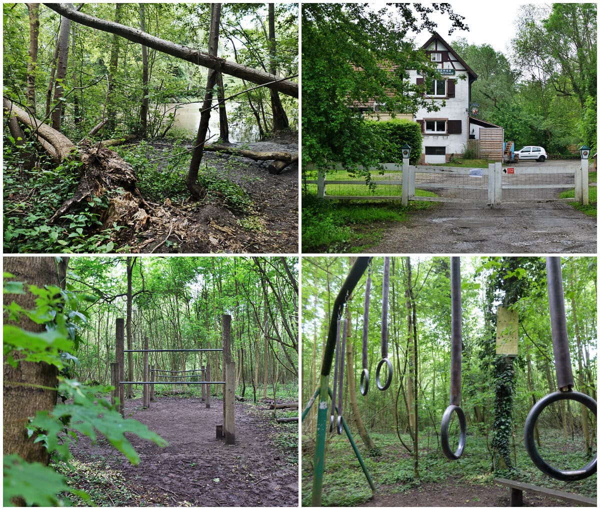 L’ambiance de cette forêt est un peu particulière… Zone de nature sauvage, le sentier semble pourtant entretenu à coups de pesticides (végétation jaunie en bordure des chemins), tandis que l’autoroute se fait très fortement entendre. On passe d’ailleurs sous le pont qui la soutient, le long de l’Ill toujours (attention aux moustiques !). Les agrès du parcours de santé s’enchaînent ensuite, tandis que vous suivez toujours le marquage du Club Vosgien (losange bleu). Laissez le parcours d’accrobranche sur votre droite et sortez de la forêt, côté parking.