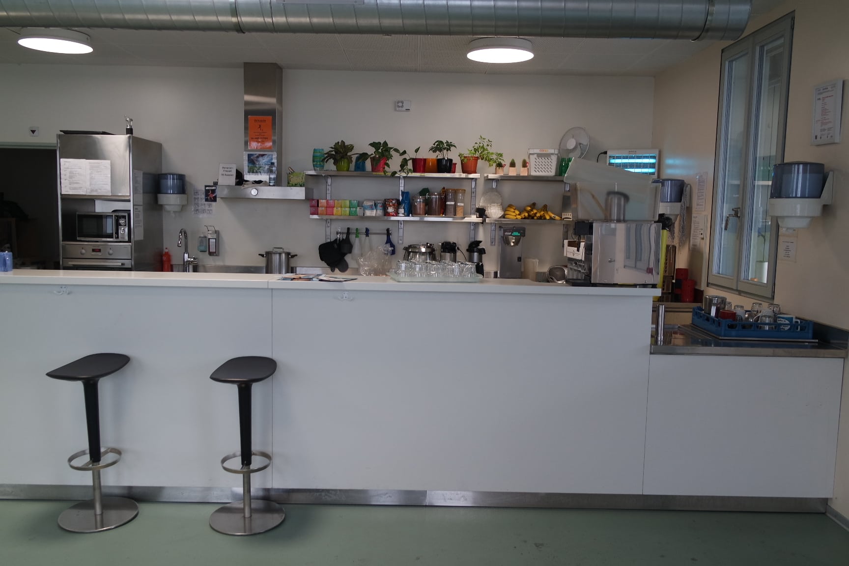 L’entrée donne sur la salle principale, une cafétéria, ce qui donne un sentiment bienvenu de convivialité dans cet univers clinique, austère et froid. On y trouve plusieurs tables, un bar, à boire et à manger. Les salles de consommation de drogues se trouvent derrière.