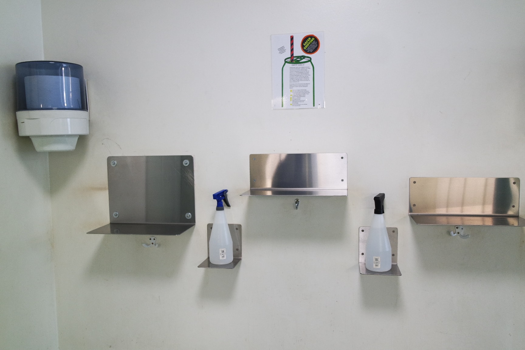 Dans le coin, on trouve encore des tablettes destinées à sniffer, avec, comme partout, du produit désinfectant à disposition.