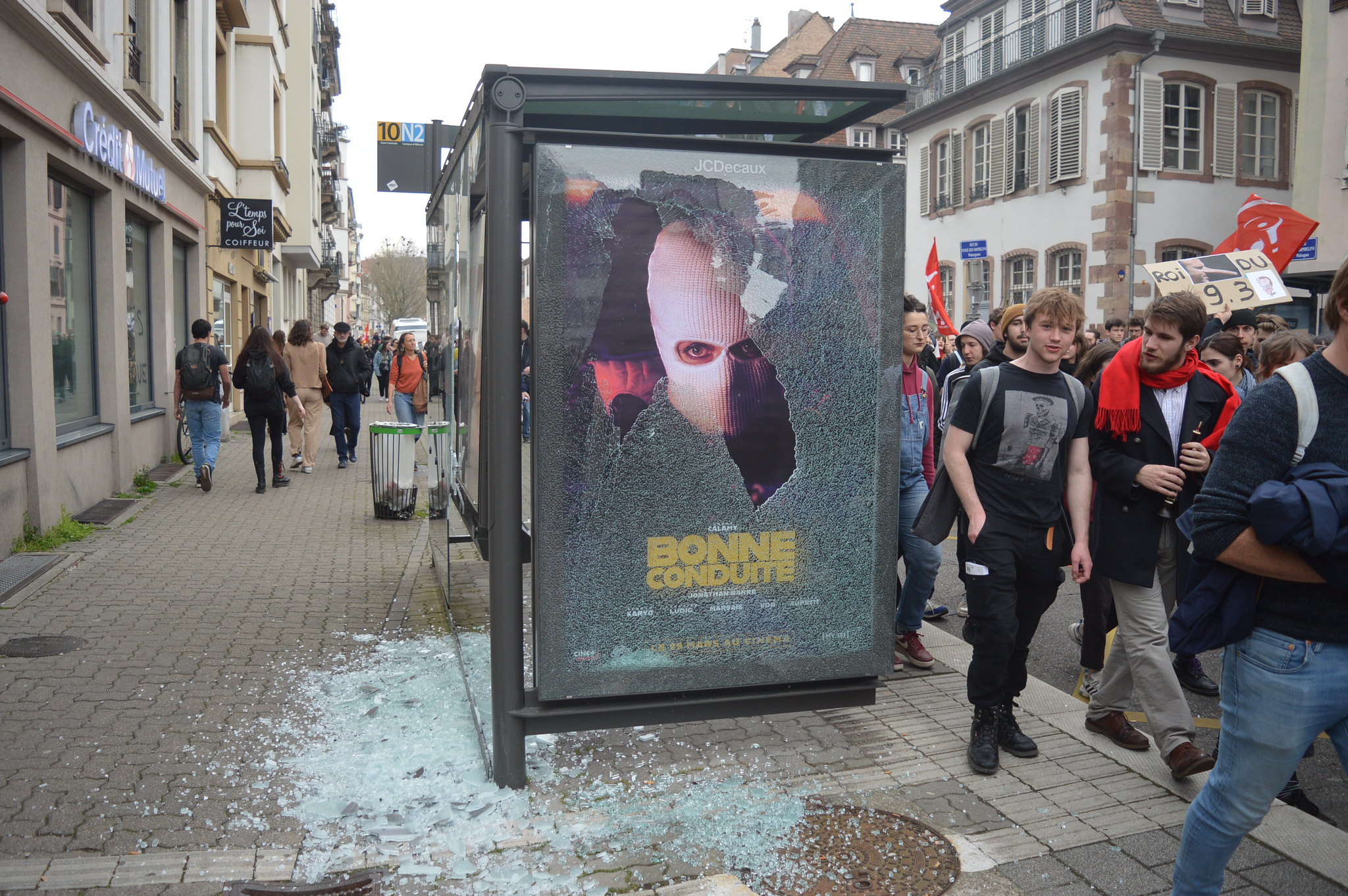 Traditionnellement tranquille, la culture de la manifestation dans la capitale alsacienne connaît un tournant avec la mobilisation contre la réforme des retraites. De mémoire de journalistes de Rue89 Strasbourg, même les Gilets jaunes n’avaient jamais provoqué autant de dégradations ciblées, entre façades de banques détruites et panneaux publicitaires brisés, barricades dressées et poubelles incendiées.