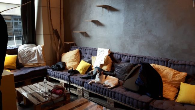 « Nous tenons particulièrement à l’éco-responsabilité. Ici, nous avons réalisé la déco’ grâce à des palettes recyclées. La protection animale est un autre point très important, et nous sommes très contentes de pouvoir offrir aux chats un nouveau confort de vie, un endroit où ils se sentent bien. Notre troisième valeur, c’est la promotion des artisans locaux. Nous proposons par exemple des boissons venues d’une petite boutique de thé strasbourgeoise, Esprit du Thé. »