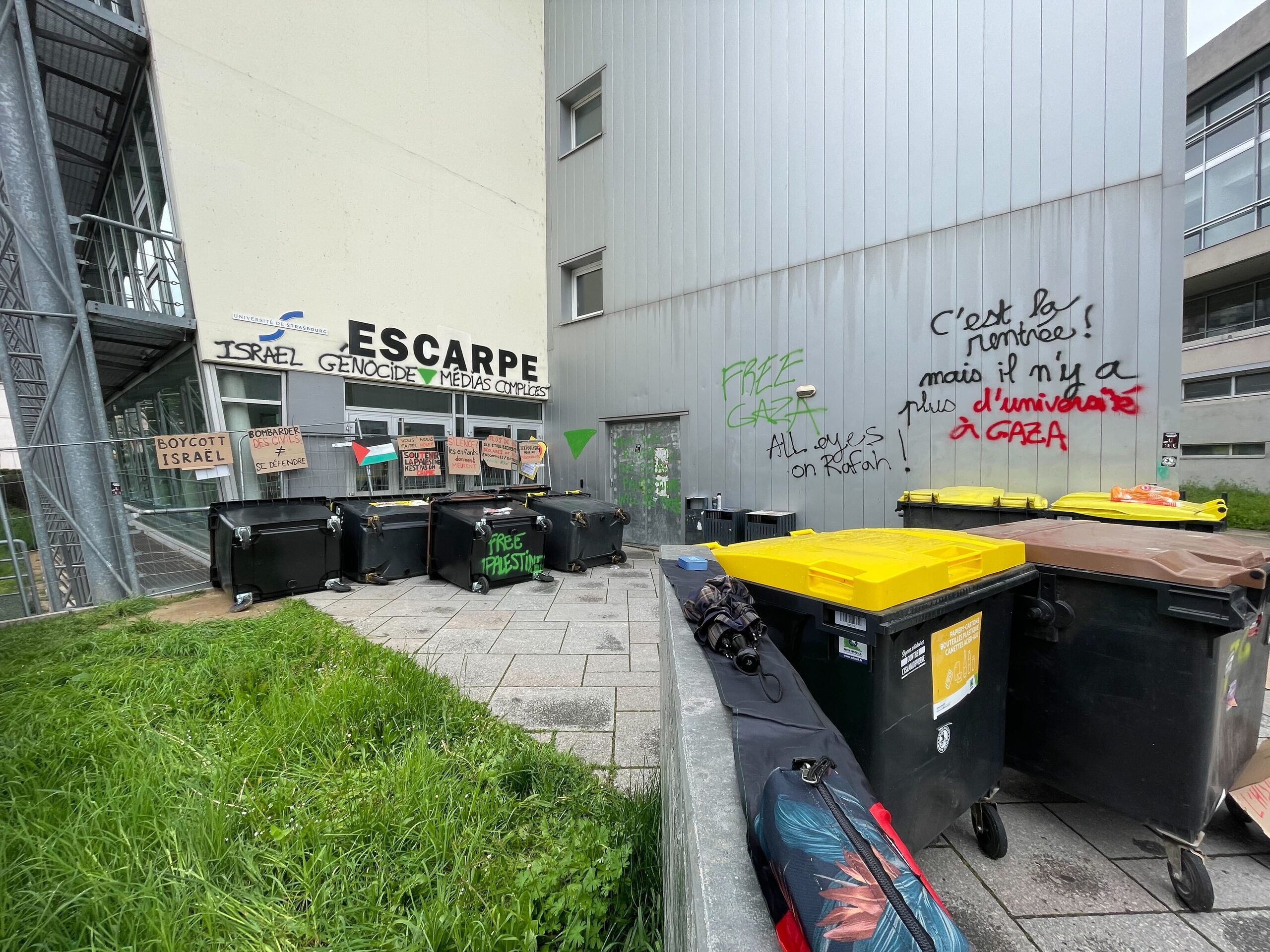 Lundi 6 mai, le bâtiment de l’Escarpe sur le campus de l’Esplanade de l’Université de Strasbourg est bloqué. Une trentaine d’étudiants empêchent d’y accéder pour demander un cessez-le-feu à Gaza. L’Escarpe abrite notamment le Centre universitaire d’enseignement du journalisme (Cuej). Après Sciences Po Strasbourg le 30 avril, c’est le deuxième blocage étudiant en soutien aux Palestiniens, bombardés par Israël depuis le 7 octobre 2023.